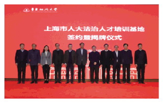 2021年12月30日,上海市人大法治人才培訓(xùn)基地簽約暨揭牌儀式在華東政法大學(xué)長寧校區(qū)舉行。上海市人大常委會(huì)主任蔣卓慶與華東政法大學(xué)黨委書記郭為祿代表雙方為“上海市人大法治人才培訓(xùn)基地”揭牌。上海市人大常委會(huì)副秘書長、辦公廳主任曹扶生與華東政法大學(xué)校長葉青共同簽署合作協(xié)議。上海市人大常委會(huì)副主任莫負(fù)春,法制委主任委員陸曉棟,法工委主任閻銳,立法專家顧問丁偉,華東政法大學(xué)黨委副書記、紀(jì)委書記應(yīng)培禮,副校長張明軍、韓強(qiáng)出席會(huì)議。會(huì)議由莫負(fù)春主持。