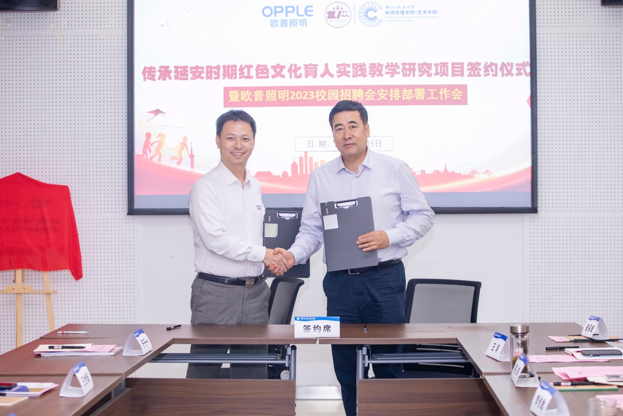 (西北政法大學(xué)新聞傳播學(xué)院(藝術(shù)學(xué)院)副院長(zhǎng)與歐普照明股份有限公司陜西分公司副總經(jīng)理王世新為“西部大學(xué)生互聯(lián)網(wǎng)+大學(xué)生創(chuàng)新創(chuàng)業(yè)數(shù)字新媒體產(chǎn)業(yè)人才孵化實(shí)訓(xùn)基地”揭牌)