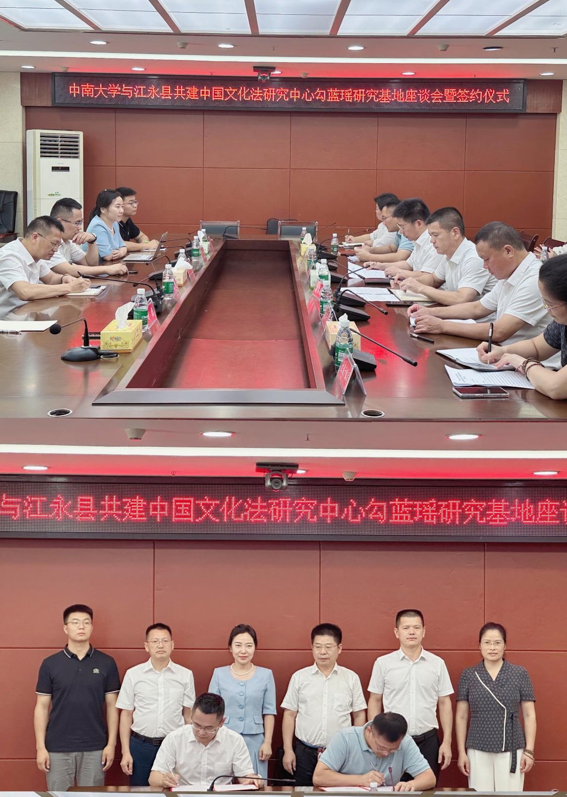 7月28日,“中南大學(xué)中國文化法研究中心勾藍瑤研究基地”在湖南省永州市江永縣蘭溪瑤族鄉(xiāng)勾藍瑤寨揭牌并簽署共建勾藍瑤研究基地合作協(xié)議,中共江永縣委書記唐德榮,縣委常委、宣傳部長高厚德,副縣長蔣劍平,中南大學(xué)法學(xué)院院長許中緣,中國文化法研究中心執(zhí)行主任易玲、法學(xué)院教授唐東楚、講師郭壬癸以及縣委各部門負責(zé)人出席座談會及簽約儀式。