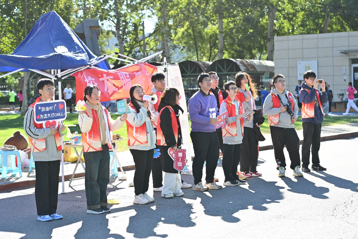賽道兩旁站滿了為運動員加油的同學,揮舞著加油棒,擊鼓呼喊著“運動員加油”的口號。志愿者、安保人員、醫(yī)務人員也堅守崗位,用熱情的服務和忙碌的身影保障比賽順利進行。