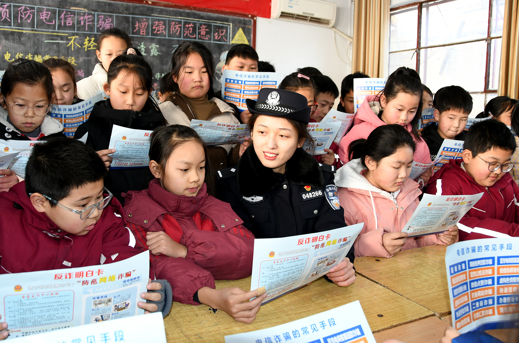 圖為1月22日,民警在實(shí)驗(yàn)小學(xué)為同學(xué)們講解防范電信詐騙知識(shí)。
