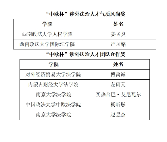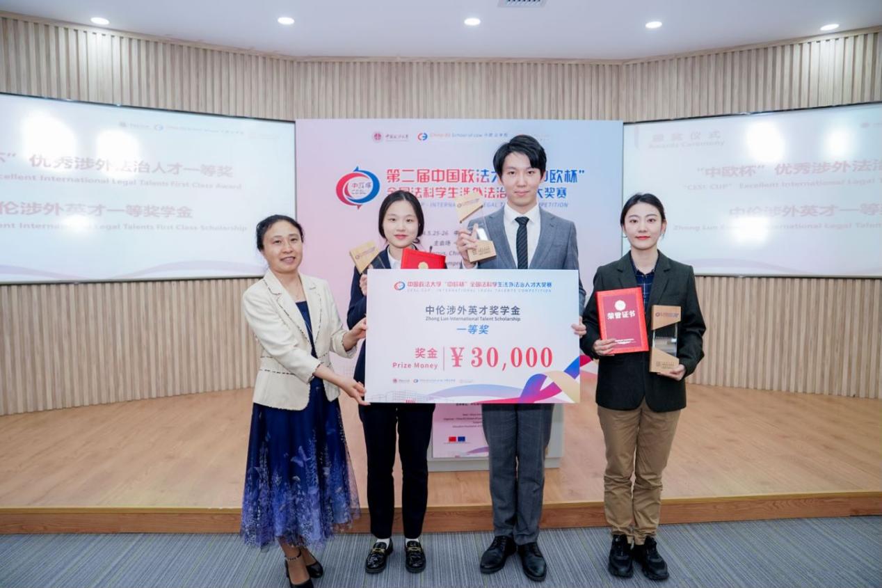 經(jīng)過激烈角逐,最終,中國人民大學(xué)湯卓筠、清華大學(xué)周士尊、湘潭大學(xué)黃靖淼3名選手榮獲“中歐杯”優(yōu)秀涉外法治人才一等獎。另有22名選手分別獲“中歐杯”優(yōu)秀涉外法治人才二等獎、三等獎、“涉外法治人才氣質(zhì)風(fēng)尚獎”“涉外法治人才團(tuán)隊(duì)合作獎”等。在5月26日下午舉行的閉幕式暨頒獎儀式上,中國政法大學(xué)黨委副書記王立艷、中倫律師事務(wù)所高級顧問王霽虹等為選手頒獎。獲獎同學(xué)同時獲得“中倫涉外英才獎學(xué)金”。
