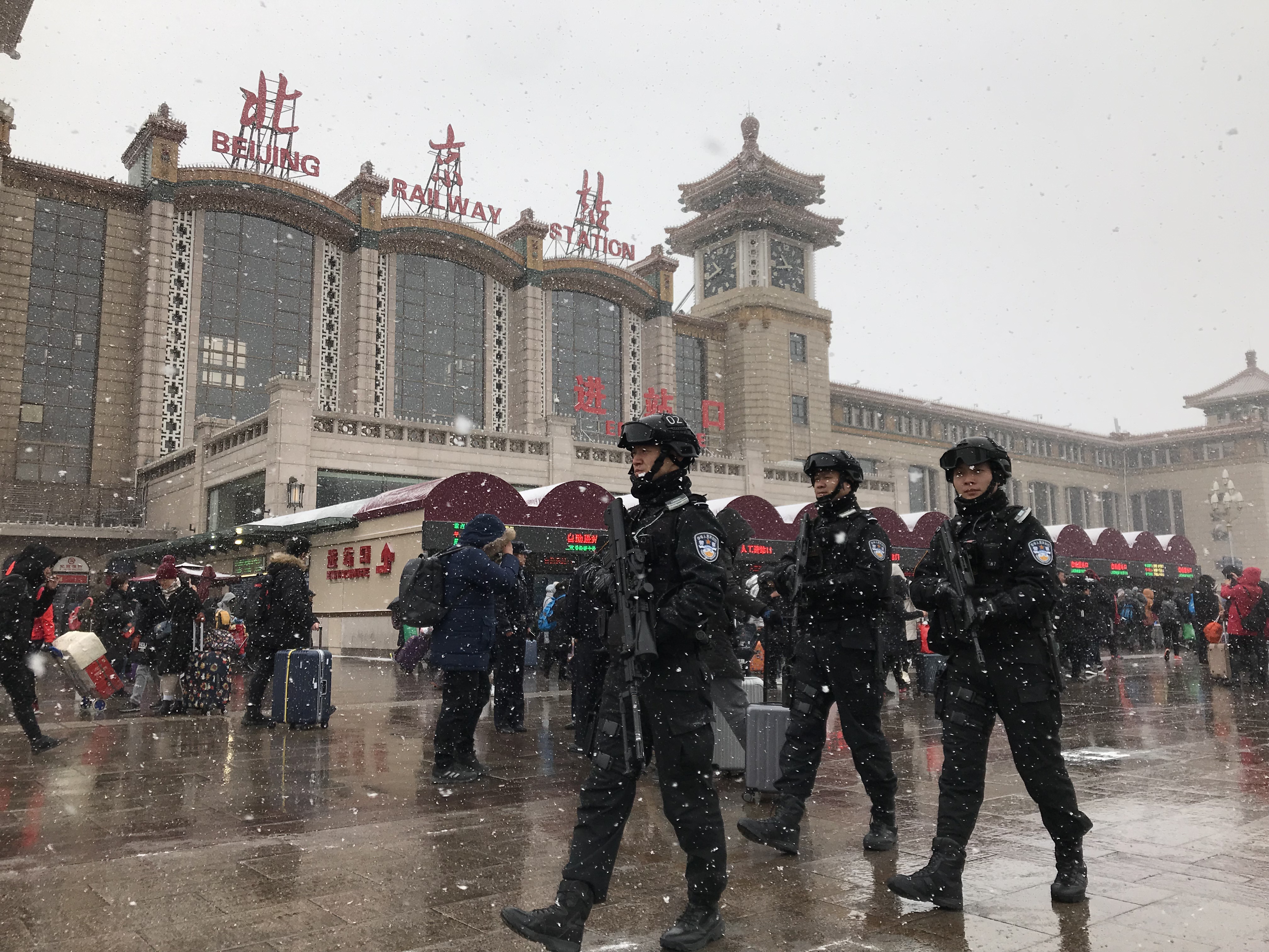 春運以來,北京鐵路公安處安排特警駐守北京站、北京西站、北京南站,加強對3大火車站的巡邏巡視、武裝震懾和盤查工作,全力確保車站治安秩序穩(wěn)定。圖為2月12日,北京大雪,參加安保任務(wù)的特警隊員們在北京各大火車站值守?! ?/p>