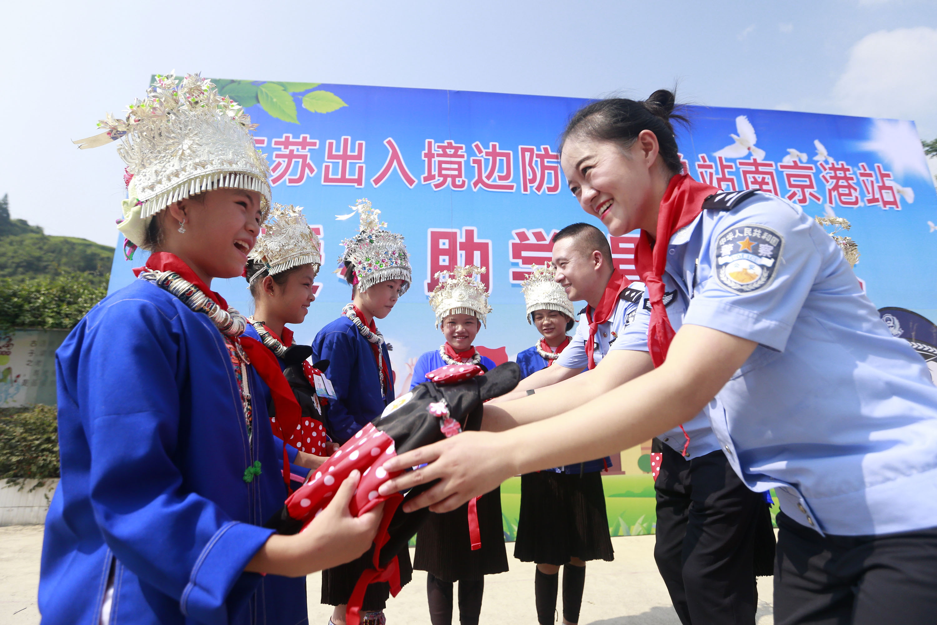 8月25日,在新學期開學之際,廣西壯族自治區(qū)柳州市三江侗族自治縣獨峒鎮(zhèn)八協(xié)小學的貧困學生領到了愛心書包。當日,江蘇南京港出入境邊防檢查站民警和企業(yè)代表來到八協(xié)小學開展愛國主義教育和愛心助學捐贈儀式主題活動,為全體學生精心準備了書包、學習用品、文體器材、衣物等禮物300套,讓孩子們開心快樂迎接新學期到來。