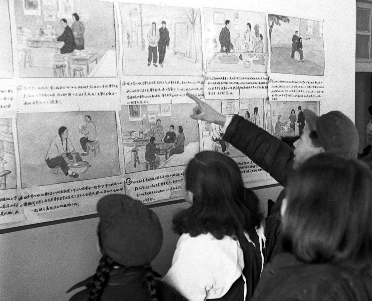 北京被服廠第四縫紉部是貫徹婚姻法的試點(diǎn)部門,青年李作斌自由戀愛及建立民主和睦家庭的經(jīng)過,被以連環(huán)畫的形式張貼出來(1953年4月2日攝)。