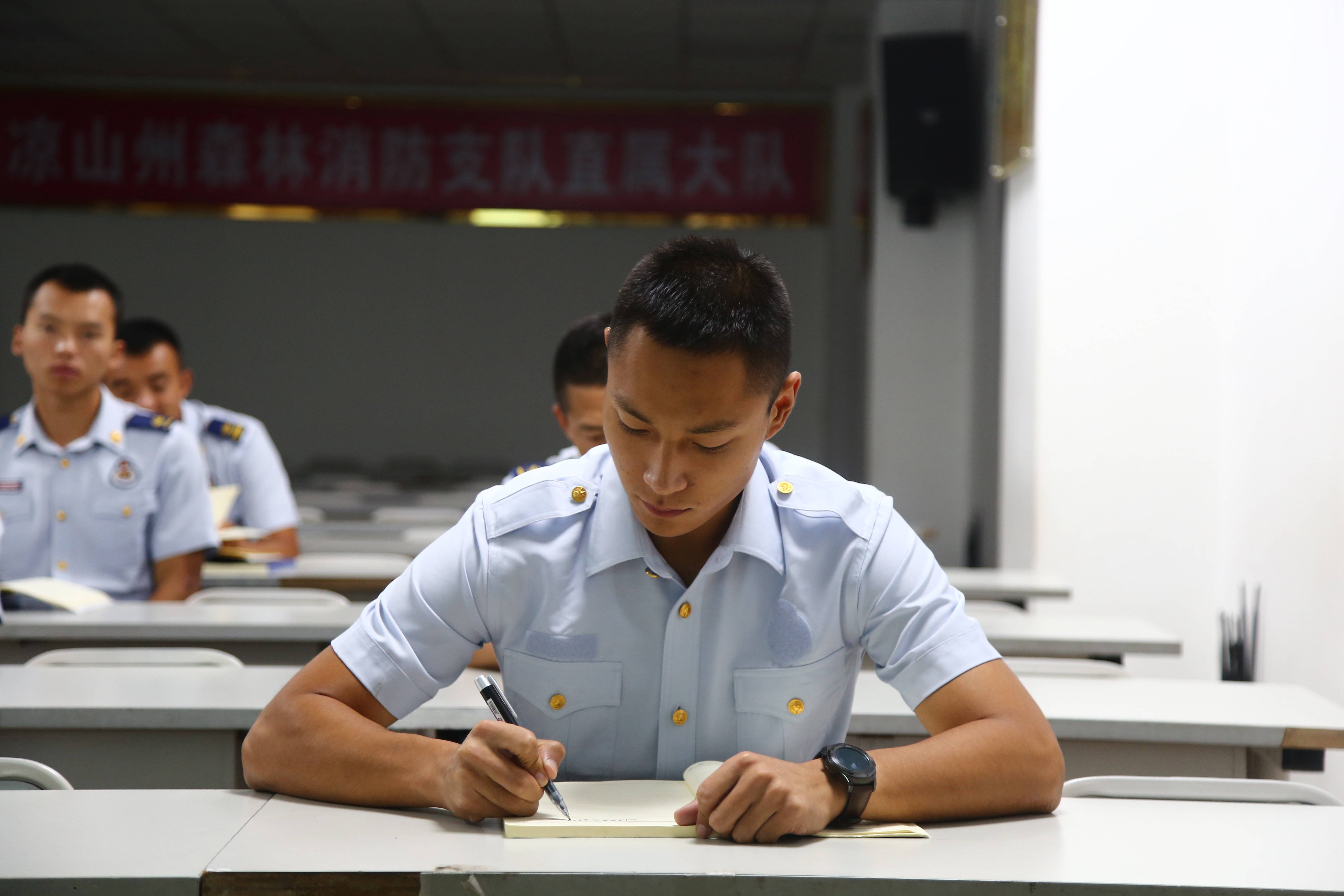 在新中國(guó)成立70周年這個(gè)特殊的日子,崗位實(shí)習(xí)正好“滿(mǎn)月”。這一天,他們守在電視機(jī)前,看到四川森林消防總隊(duì)消防員侯正超和其他消防指戰(zhàn)員代表在“眾志成城”彩車(chē)上向全國(guó)人民敬禮時(shí),眼里滿(mǎn)是驕傲和自豪?!疤鸷沉?!”看到祖國(guó)越來(lái)越強(qiáng)大,田祥由衷贊嘆。睡覺(jué)前,他寫(xiě)了“不忘入隊(duì)初心,牢記職責(zé)使命,繼續(xù)前進(jìn)”在筆記本上。