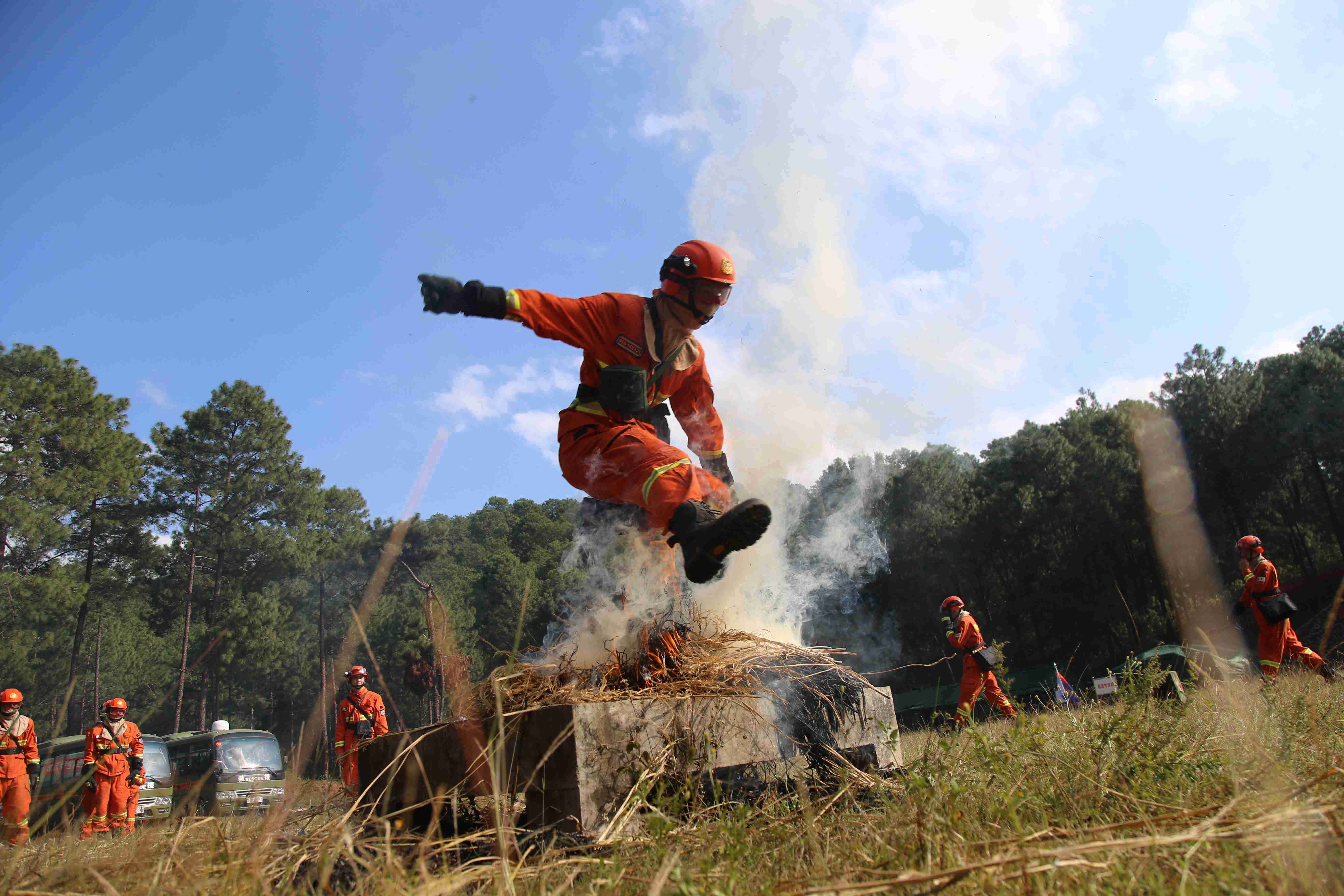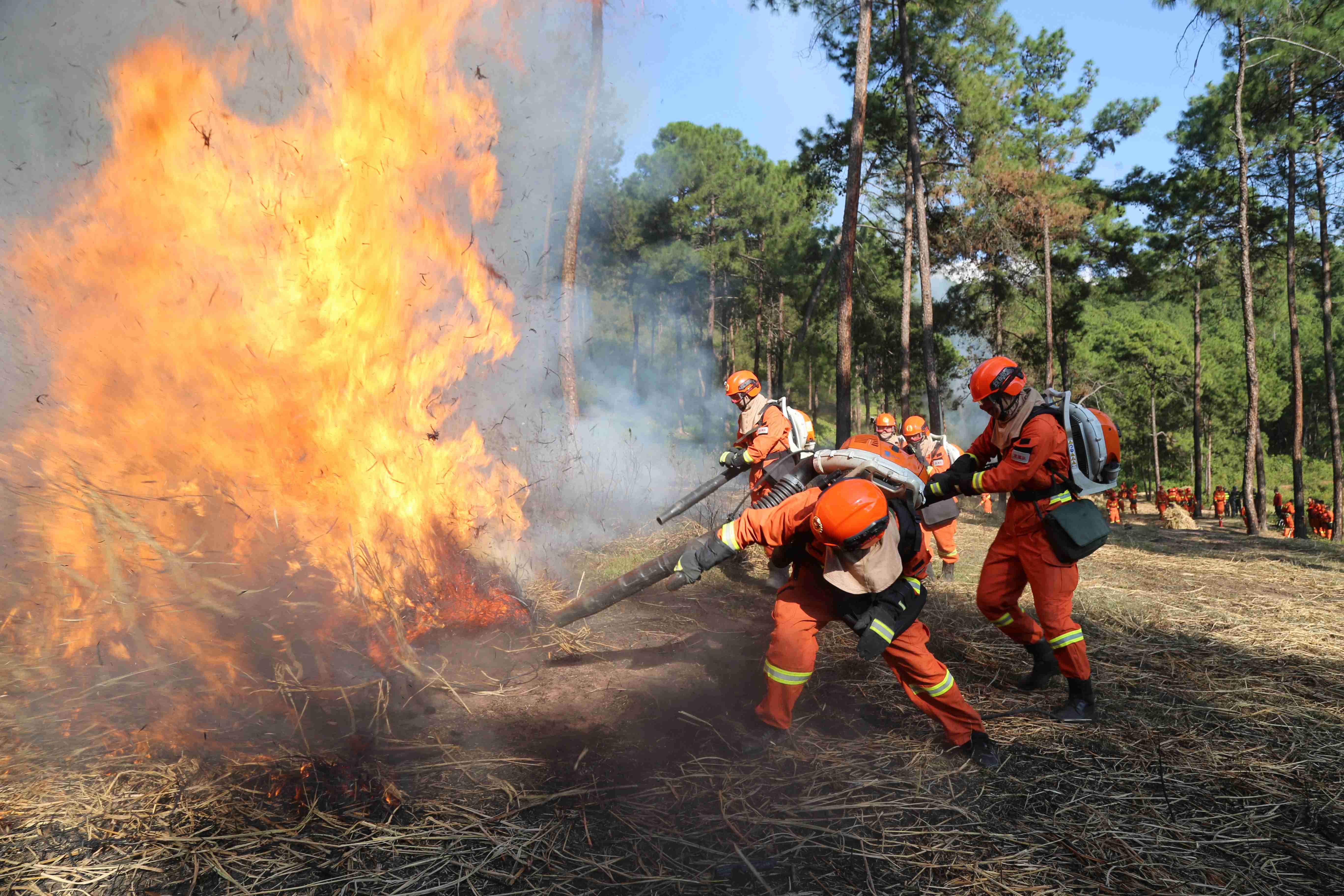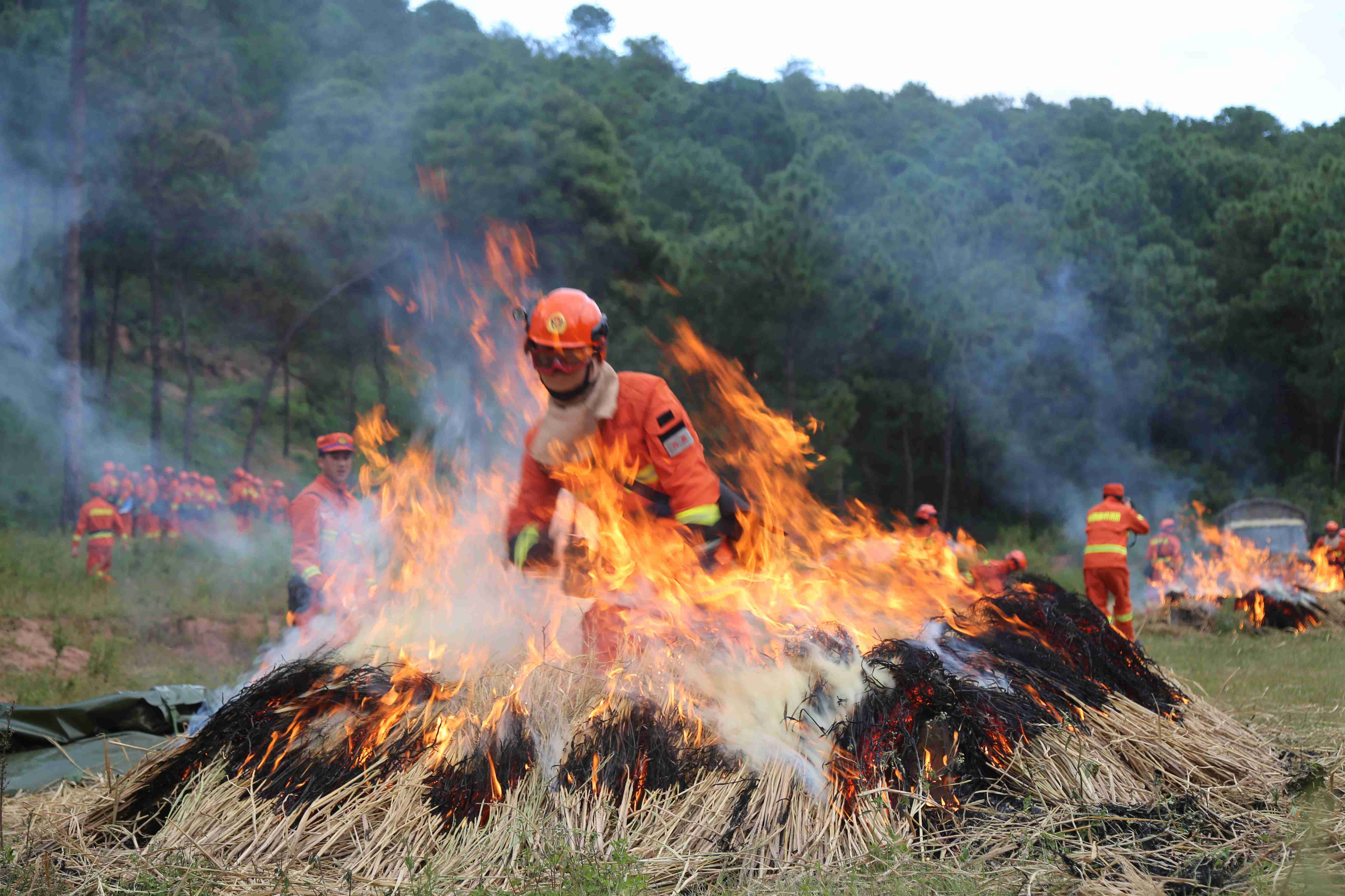 火燒了起來,加斯伍各看到中隊長“開始”的手勢,帶頭沖了上去,與灼熱的氣浪剛打了個照面,他本能地后退了幾步,但一想到老隊員都在身后看著,這個要強(qiáng)的彝族小伙不服輸?shù)哪枪蓜乓幌戮蜕蟻砹耍瑩]舞著手中的風(fēng)機(jī)與火魔斗了起來。