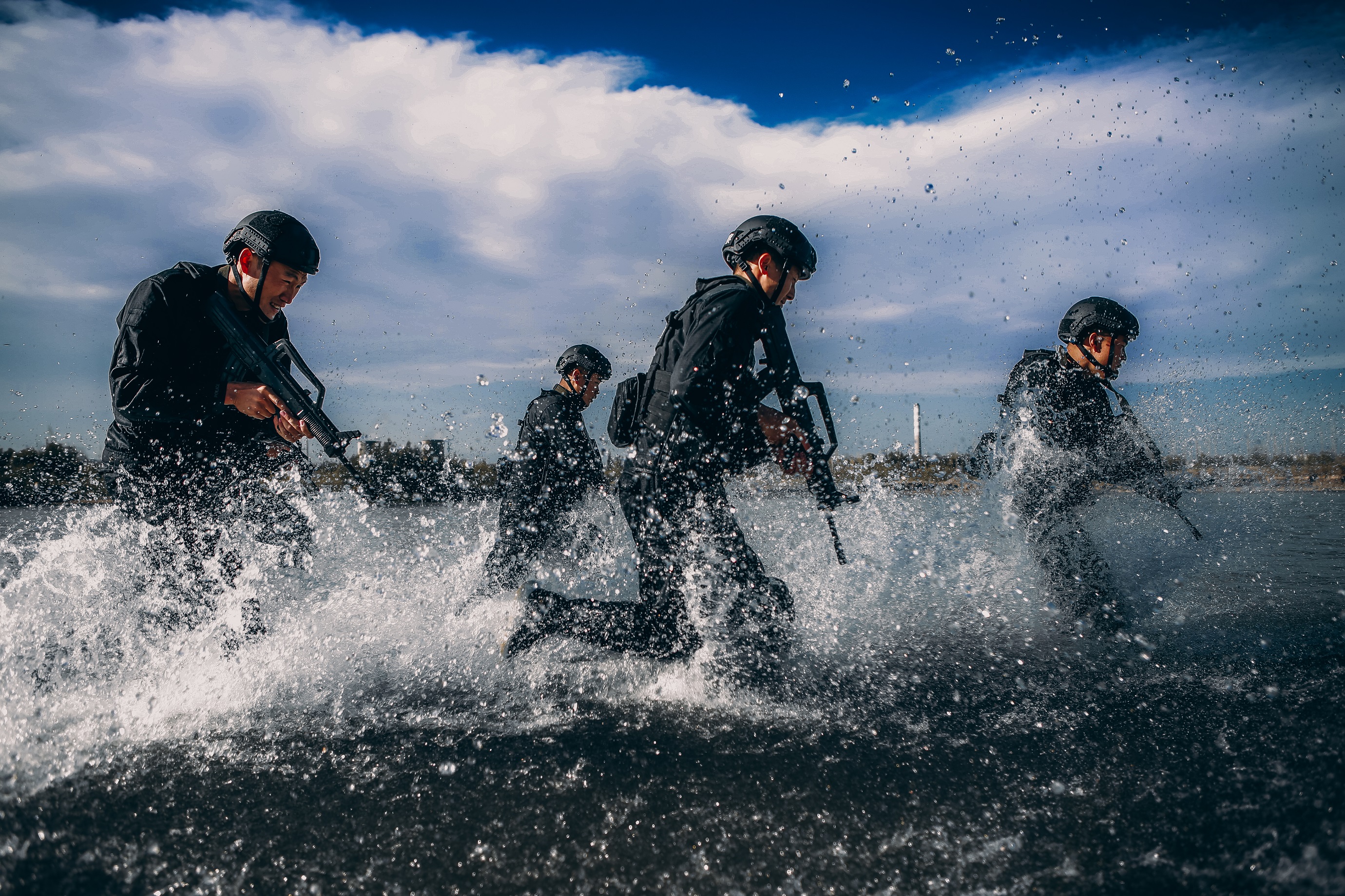 近日,2020年新疆全區(qū)公安機關新一期新錄用人員入警培訓班組織全體學員,因地制宜在伊犁河開展武裝泅渡、河流搜索、水面救援、綜合體能等實戰(zhàn)化練兵訓練,強化全體參訓學員的臨戰(zhàn)心理、實戰(zhàn)技能和戰(zhàn)術應用。圖為:新警們在開展實戰(zhàn)訓練。