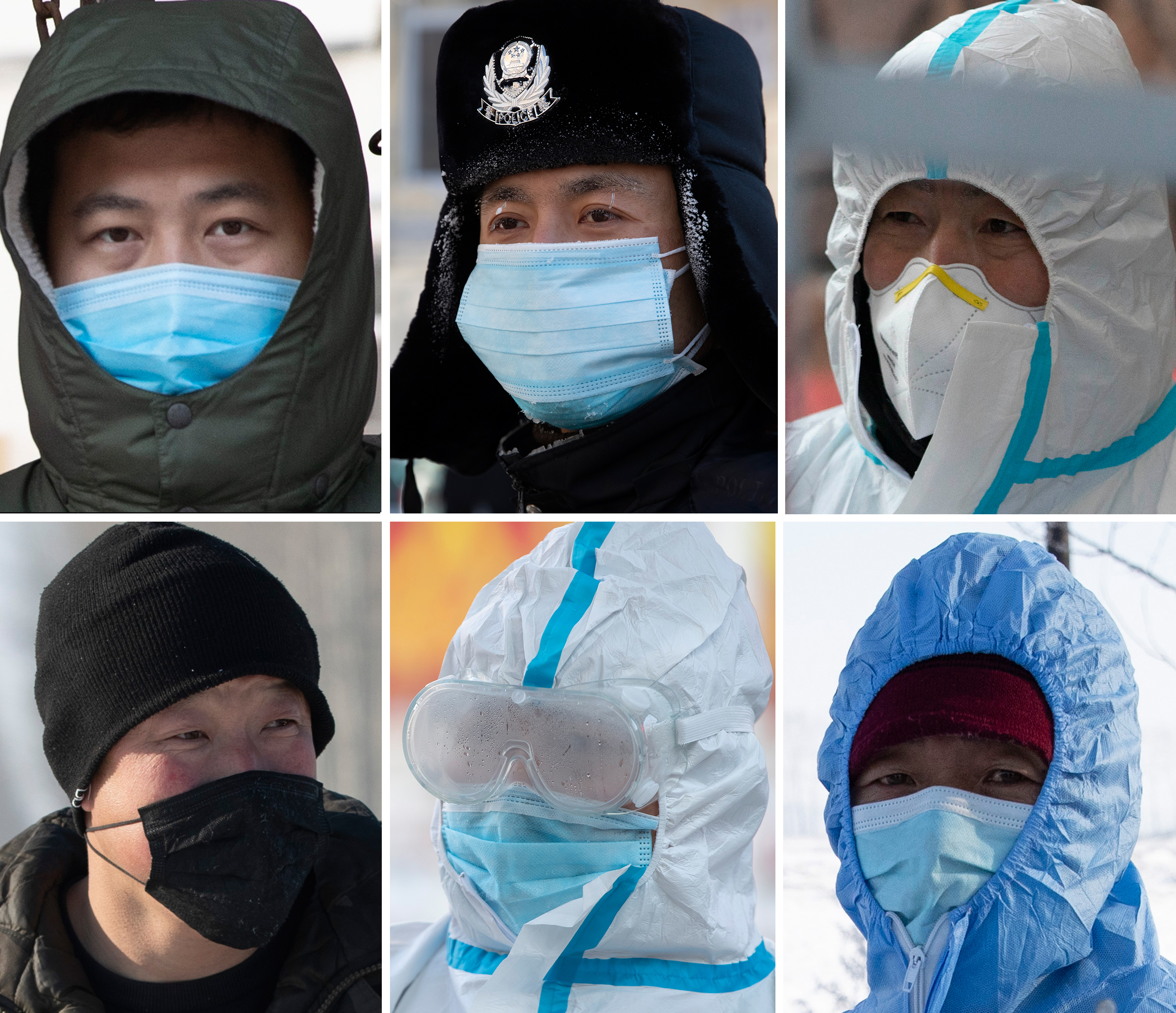 這是一張拼版照片。上圖從左至右為:1月16日,在綏化市尚志小學家屬樓小區(qū)卡點,工作人員在執(zhí)勤;1月16日,執(zhí)勤民警在綏化市靖宇小學核酸檢測點維持秩序;1月15日,志愿者在望奎縣華騰園小區(qū)內(nèi)值班。下圖從左至右為:1月15日,在望奎縣后三鄉(xiāng)一村莊,志愿者在卡點前值班;1月16日,在綏化市尚志小學核酸檢測點,工作人員的護目鏡已經(jīng)模糊;1月15日,在望奎縣后三鄉(xiāng)一村莊,巡邏員在巡查中。