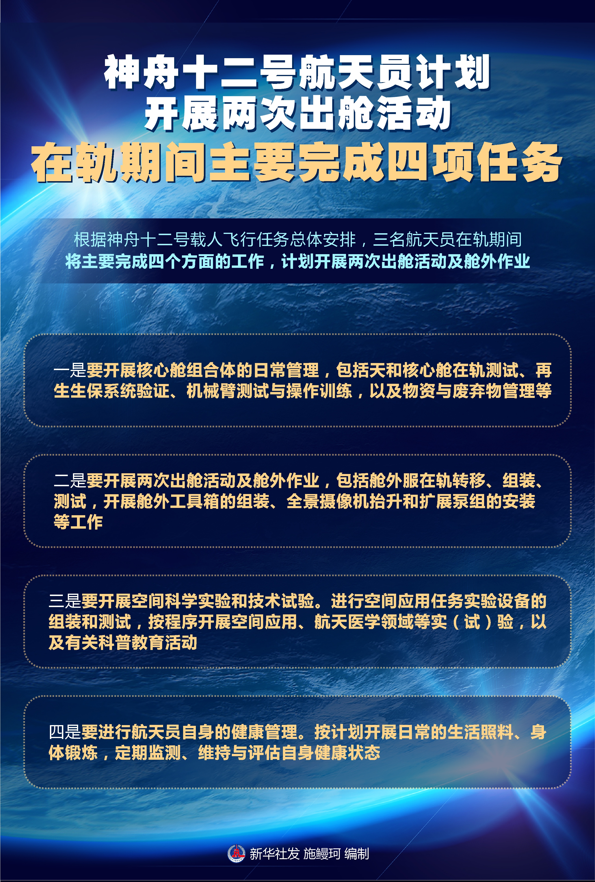 圖表:神舟十二號(hào)航天員計(jì)劃開(kāi)展兩次出艙活動(dòng) 在軌期間主要完成四項(xiàng)任務(wù)