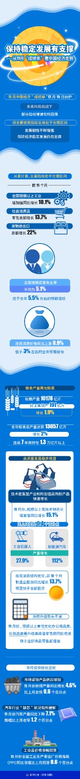 11月中國(guó)經(jīng)濟(jì)“成績(jī)單”12月15日出爐,多重風(fēng)險(xiǎn)挑戰(zhàn)下,部分指標(biāo)增速有所回落,但主要宏觀(guān)指標(biāo)總體處于合理區(qū)間,發(fā)展韌性不斷增強(qiáng),保持經(jīng)濟(jì)穩(wěn)定發(fā)展仍有支撐。
