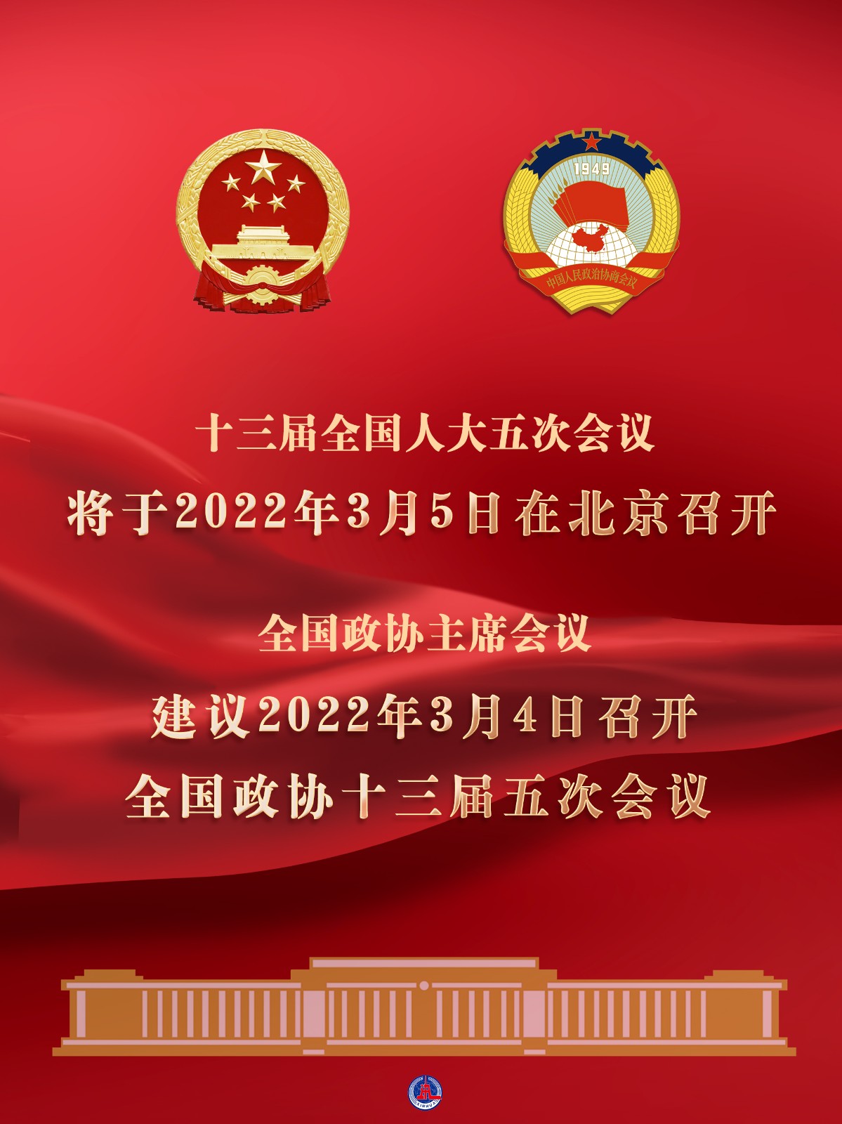 海報(bào):十三屆全國人大五次會(huì)議將于2022年3月5日在北京召開 全國政協(xié)主席會(huì)議建議2022年3月4日召開全國政協(xié)十三屆五次會(huì)議
