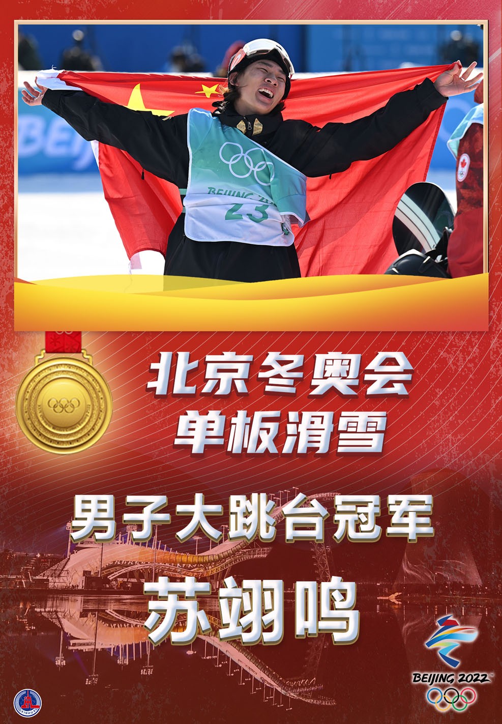 2月15日,北京2022年冬奧會單板滑雪男子大跳臺決賽在北京首鋼滑雪大跳臺舉行。中國選手蘇翊鳴奪得金牌。