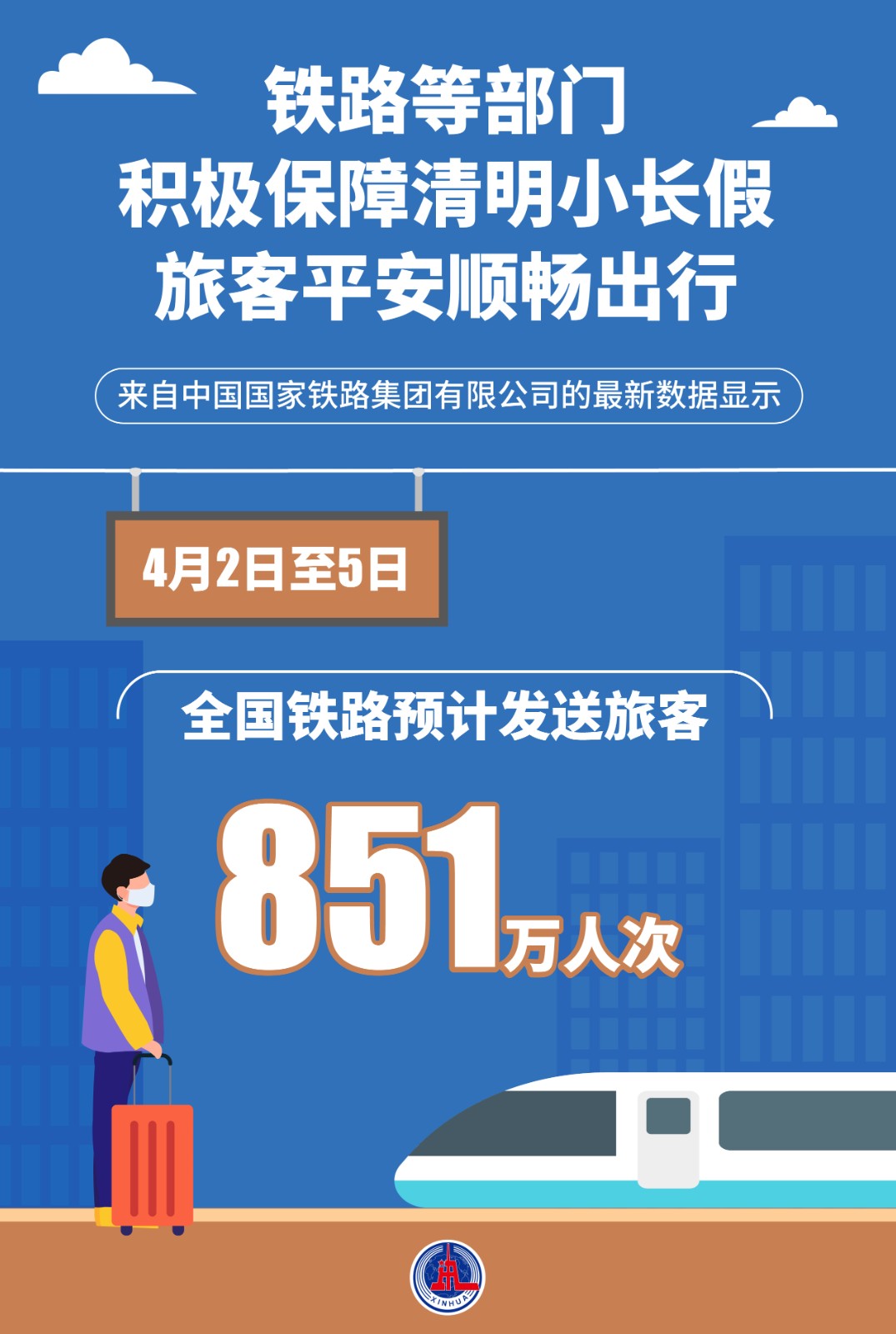 全國(guó)鐵路清明假期運(yùn)輸期限為4月2日至5日共4天。來(lái)自中國(guó)國(guó)家鐵路集團(tuán)有限公司的最新數(shù)據(jù)顯示,2日至5日,全國(guó)鐵路預(yù)計(jì)發(fā)送旅客851萬(wàn)人次,鐵路運(yùn)輸平穩(wěn)有序。