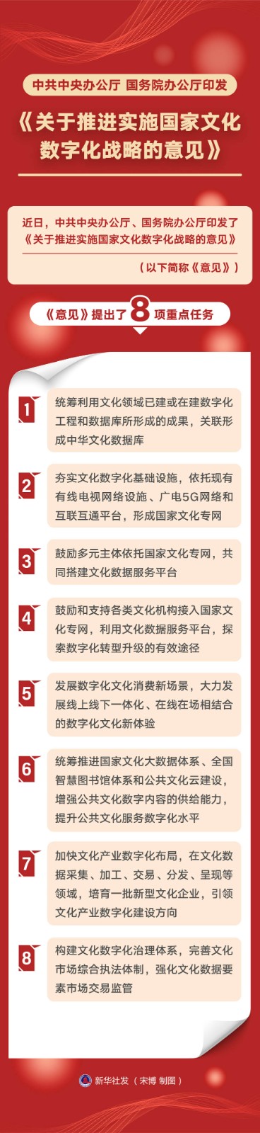 近日,中共中央辦公廳、國務(wù)院辦公廳印發(fā)了《關(guān)于推進實施國家文化數(shù)字化戰(zhàn)略的意見》,并發(fā)出通知,要求各地區(qū)各部門結(jié)合實際認真貫徹落實。