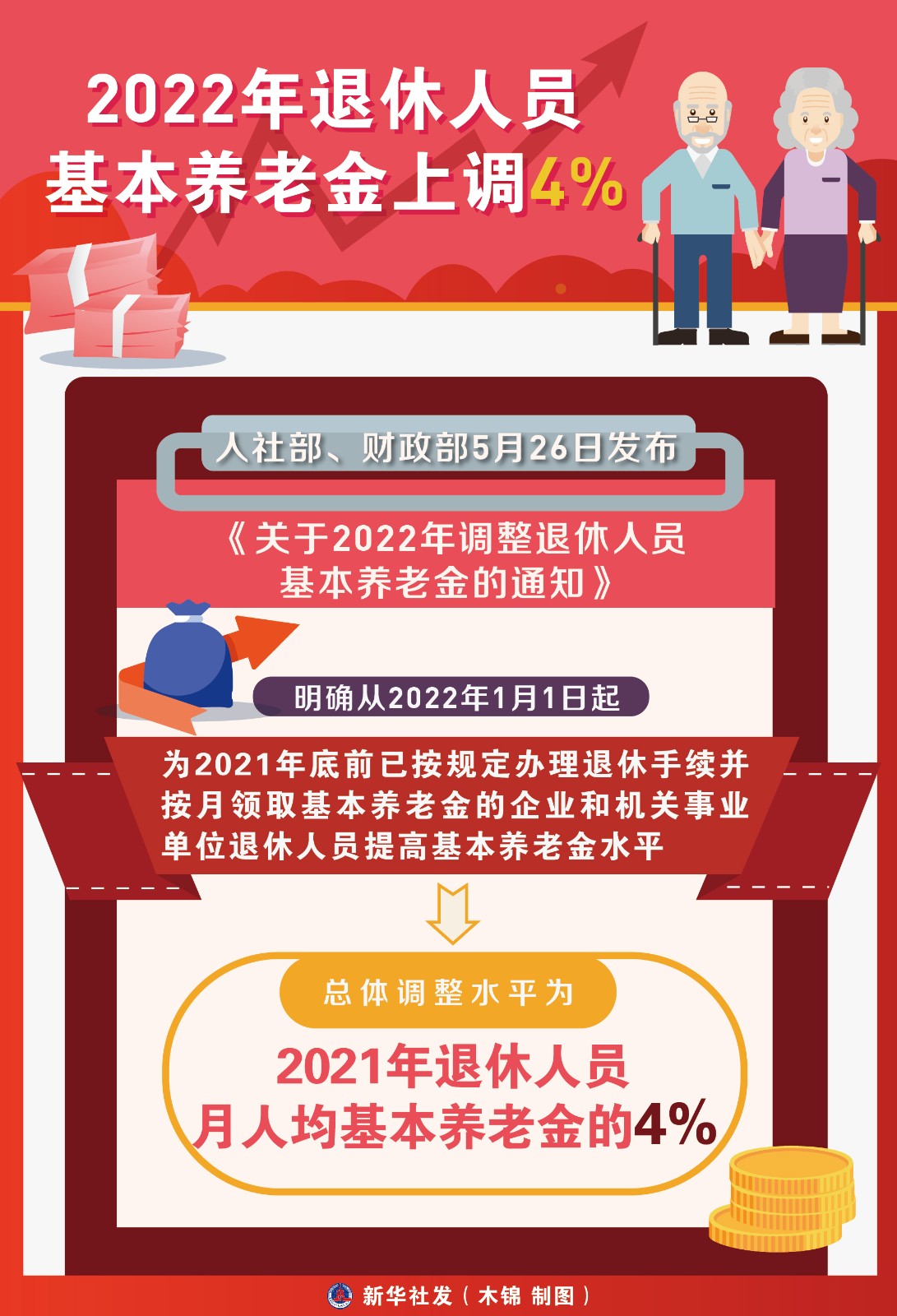 人社部、財政部5月26日發(fā)布《關(guān)于2022年調(diào)整退休人員基本養(yǎng)老金的通知》,明確從2022年1月1日起,為2021年底前已按規(guī)定辦理退休手續(xù)并按月領(lǐng)取基本養(yǎng)老金的企業(yè)和機關(guān)事業(yè)單位退休人員提高基本養(yǎng)老金水平,總體調(diào)整水平為2021年退休人員月人均基本養(yǎng)老金的4%。