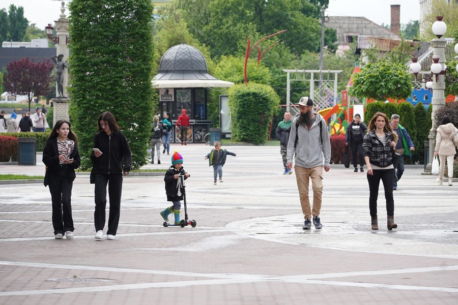 5月31日,當(dāng)?shù)鼐用裨跒蹩颂m基輔州伊爾平中心廣場散步。