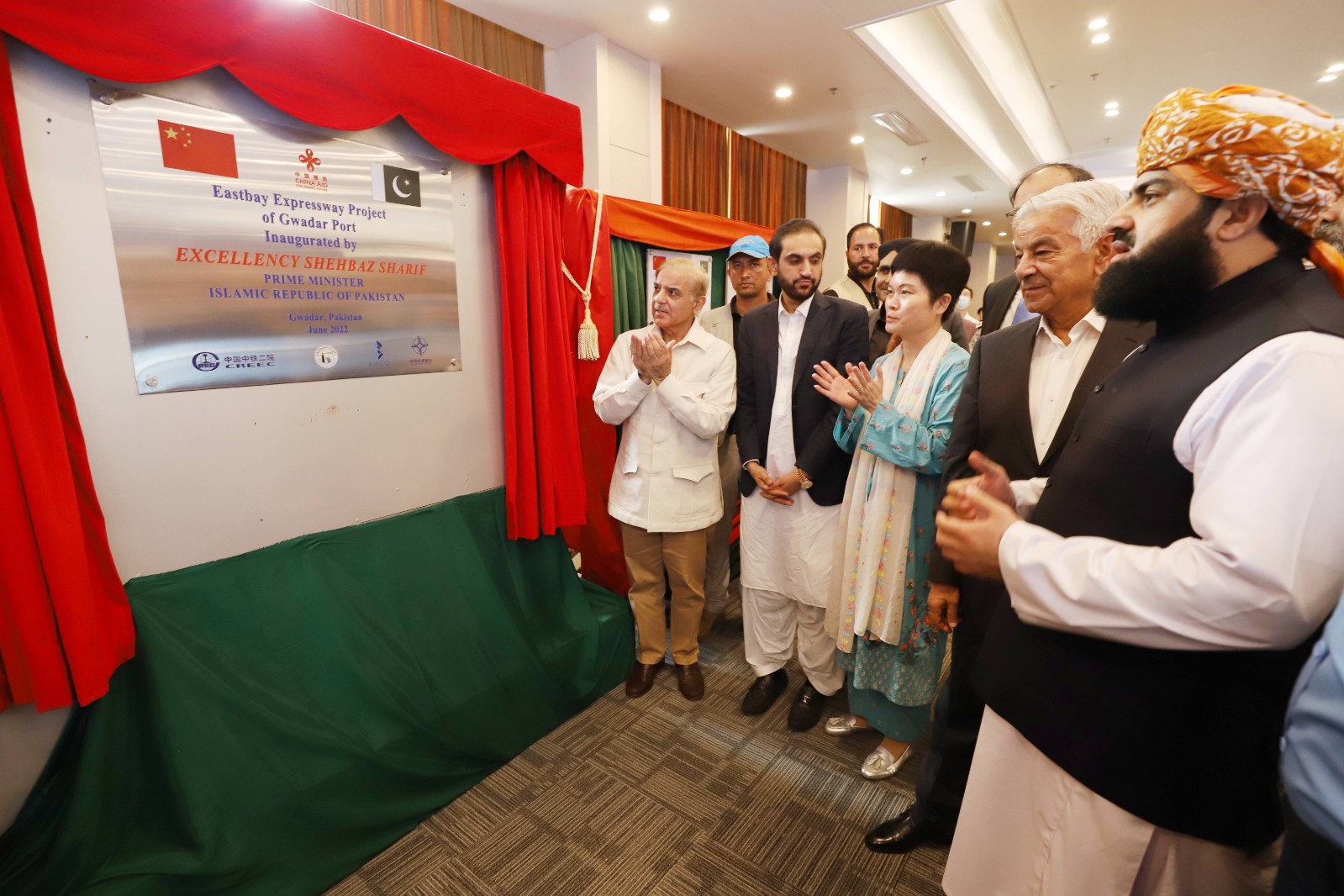 6月3日,在巴基斯坦西南部俾路支省瓜達(dá)爾,巴基斯坦總理夏巴茲·謝里夫(左一)為瓜達(dá)爾東灣快速路通車揭牌。
