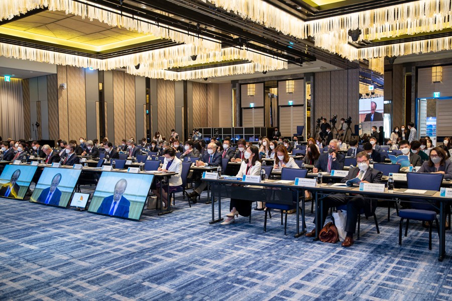 這是6月14日在韓國首爾拍攝的2022年中日韓合作國際論壇現場。