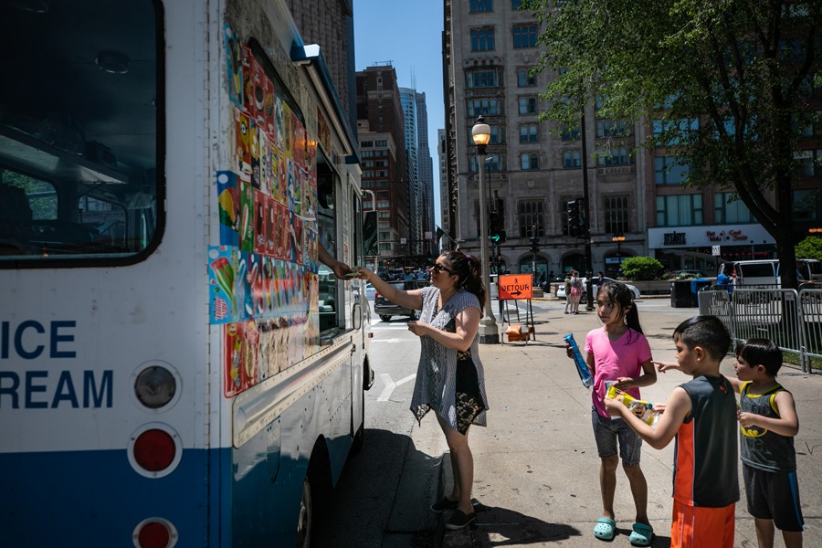6月14日,在美國(guó)芝加哥,一名女子給孩子買(mǎi)冷飲。
