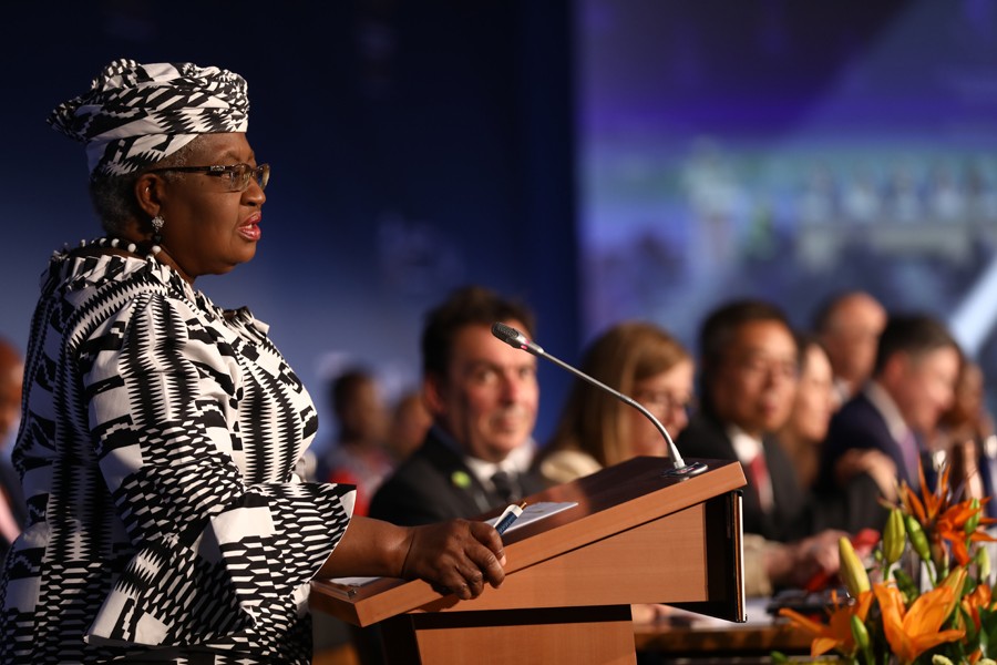 6月12日,世界貿(mào)易組織總干事伊維拉(前)在瑞士日內(nèi)瓦舉行的世貿(mào)組織第12屆部長級會議開幕式上致辭。