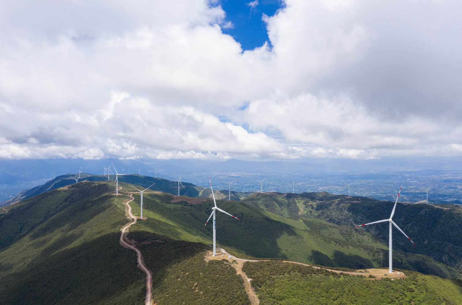 這是位于四川鹽源縣平川鎮(zhèn)的四川鹽源華電新能源有限公司的小高山風(fēng)電場一角(6月20日攝,無人機(jī)照片)。