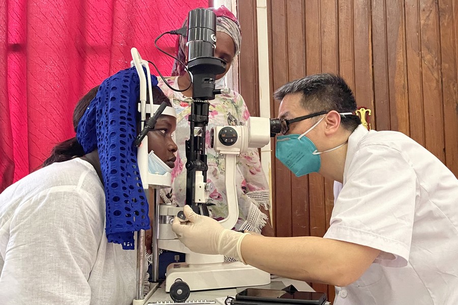 6月23日,在塞內(nèi)加爾坦巴昆達(dá)大區(qū)議會(huì)大樓會(huì)議廳,中國(guó)醫(yī)生為病人進(jìn)行診療。
