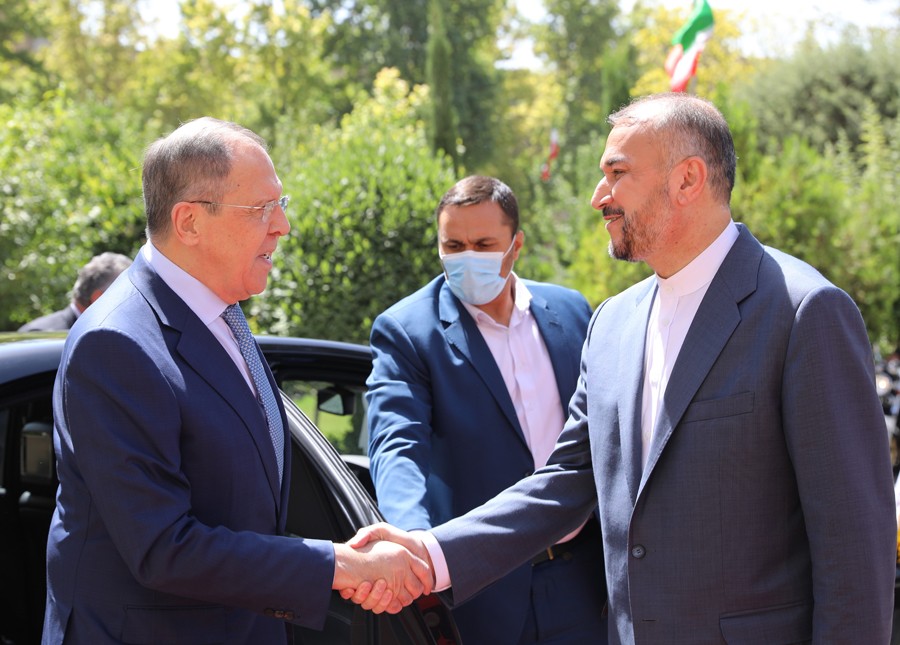 6月23日,伊朗外長(zhǎng)阿卜杜拉希揚(yáng)(右)在德黑蘭迎接俄羅斯外長(zhǎng)拉夫羅夫。