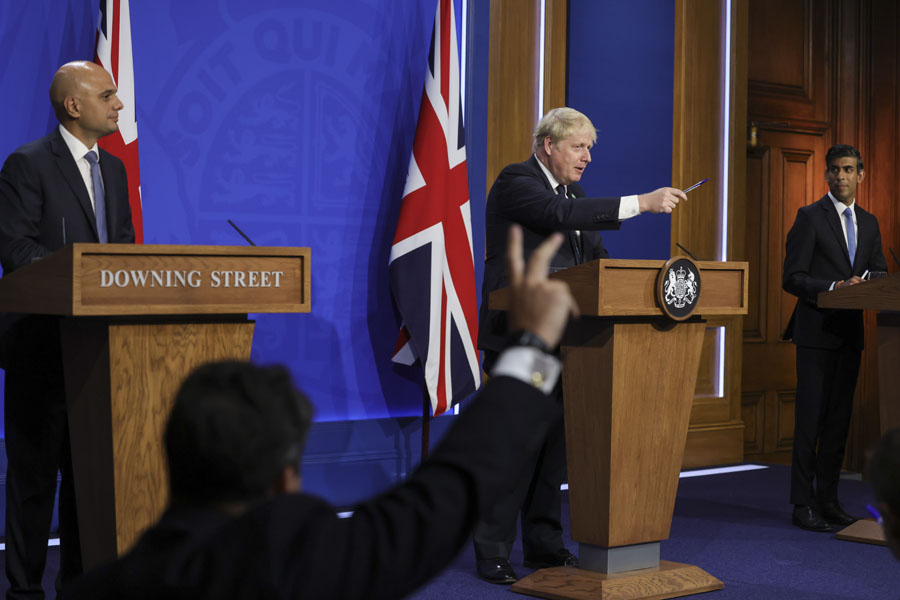 這是2021年9月7日,英國(guó)首相約翰遜(中)、衛(wèi)生大臣賈維德(左)和財(cái)政大臣蘇納克在倫敦出席新聞發(fā)布會(huì)。