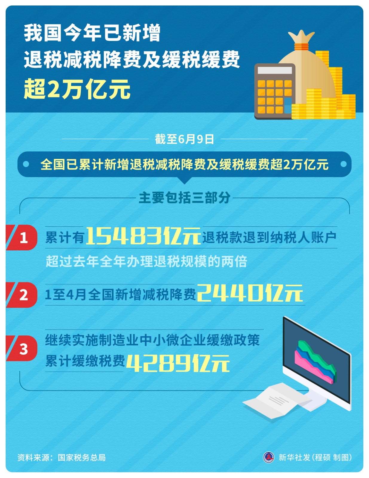 國家稅務(wù)總局6月10日數(shù)據(jù)顯示,截至6月9日,全國已累計(jì)新增退稅減稅降費(fèi)及緩稅緩費(fèi)超2萬億元。