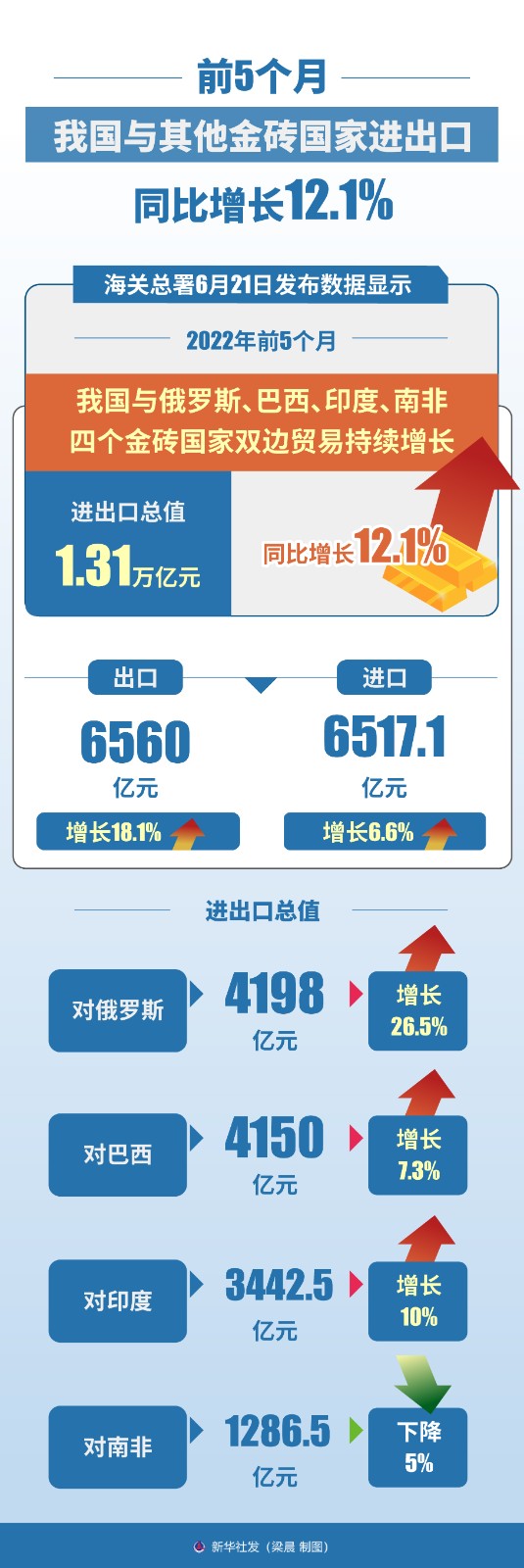 海關總署6月21日發(fā)布數(shù)據(jù)顯示,今年前5個月,我國與俄羅斯、巴西、印度、南非四個金磚國家雙邊貿(mào)易持續(xù)增長,進出口總值1.31萬億元,同比增長12.1%,高出同期我國外貿(mào)整體增速3.8個百分點。
