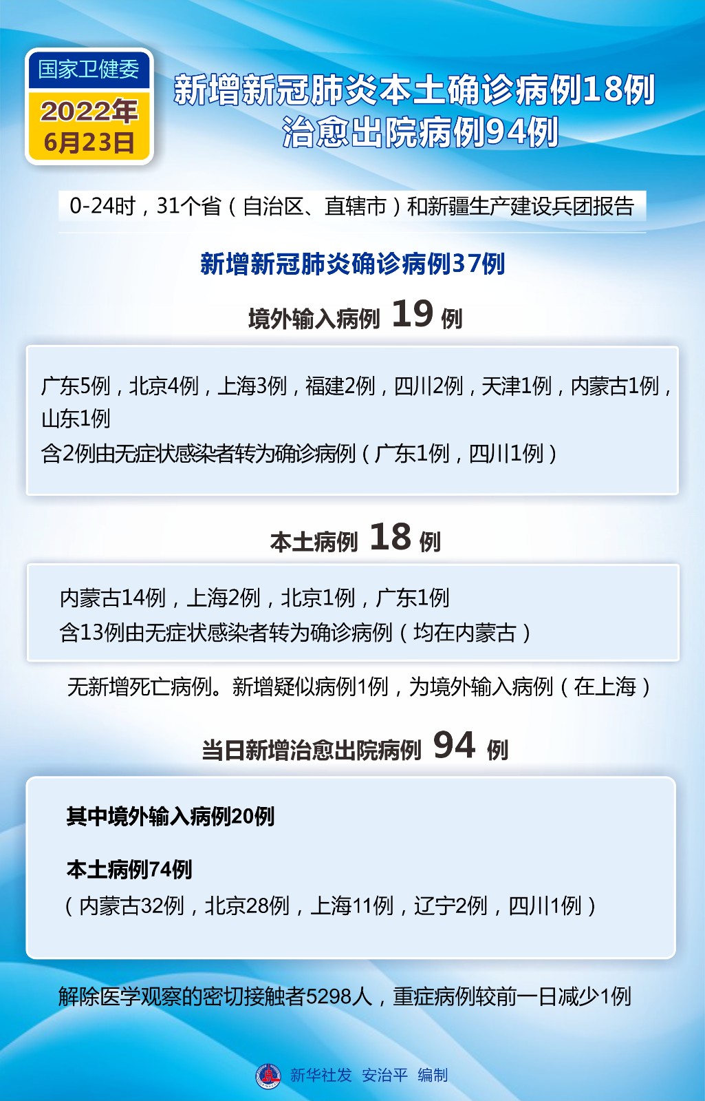 圖表:國(guó)家衛(wèi)健委:6月23日新增新冠肺炎本土確診病例18例 治愈出院病例94例