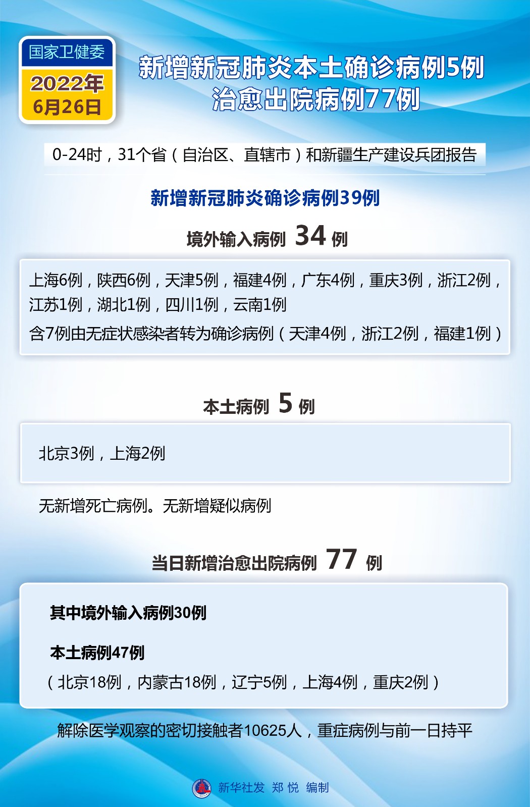 圖表:國(guó)家衛(wèi)健委:6月26日新增新冠肺炎本土確診病例5例 治愈出院病例77例
