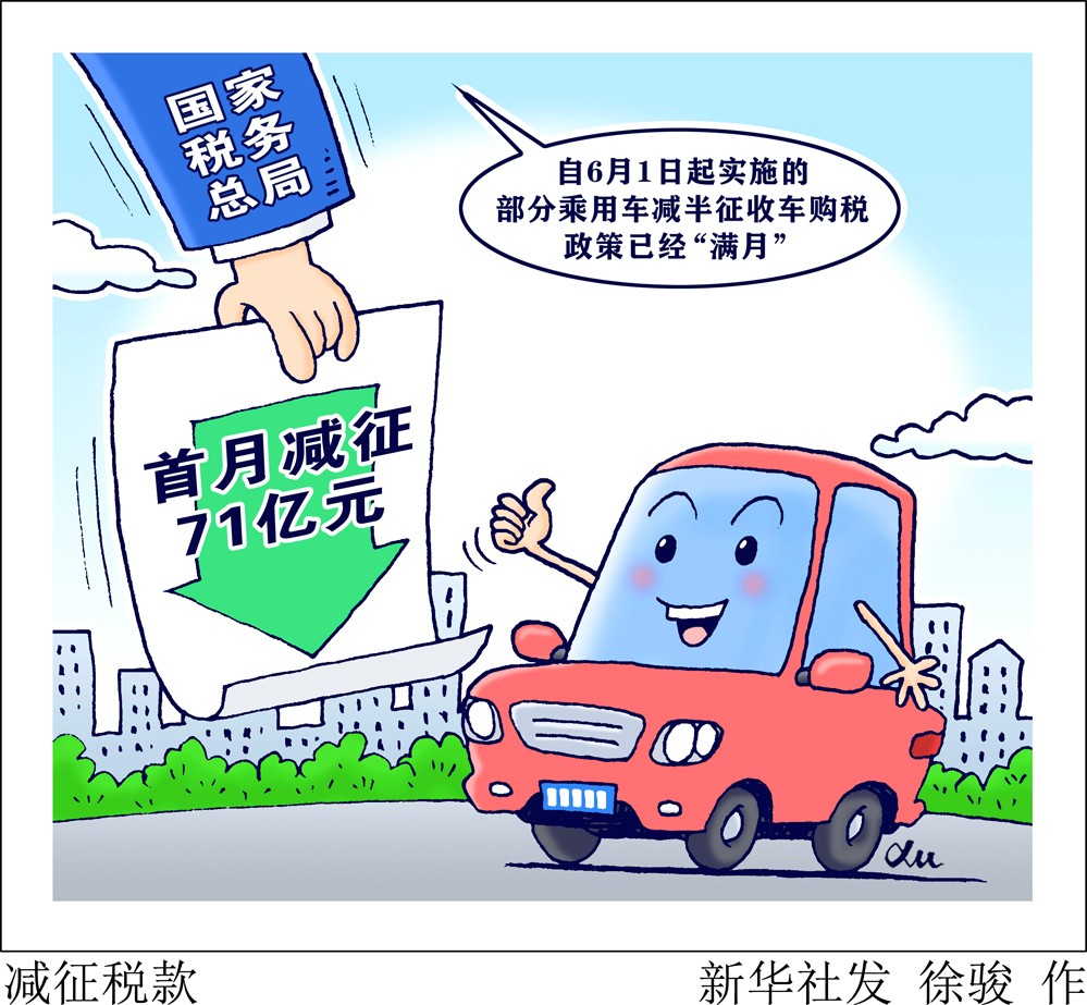 自6月1日起實施的部分乘用車減半征收車購稅政策已經(jīng)“滿月”。國家稅務總局最新數(shù)據(jù)顯示,政策實施首月,全國共減征車購稅71億元,減征車輛109.7萬輛。