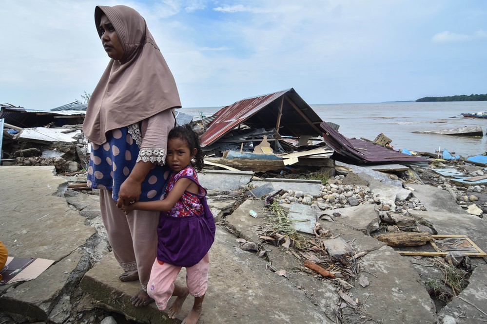 7月29日,在印尼中蘇拉威西省帕里吉莫烏通縣托魯埃村,人們站在被洪水損壞的房屋附近。
