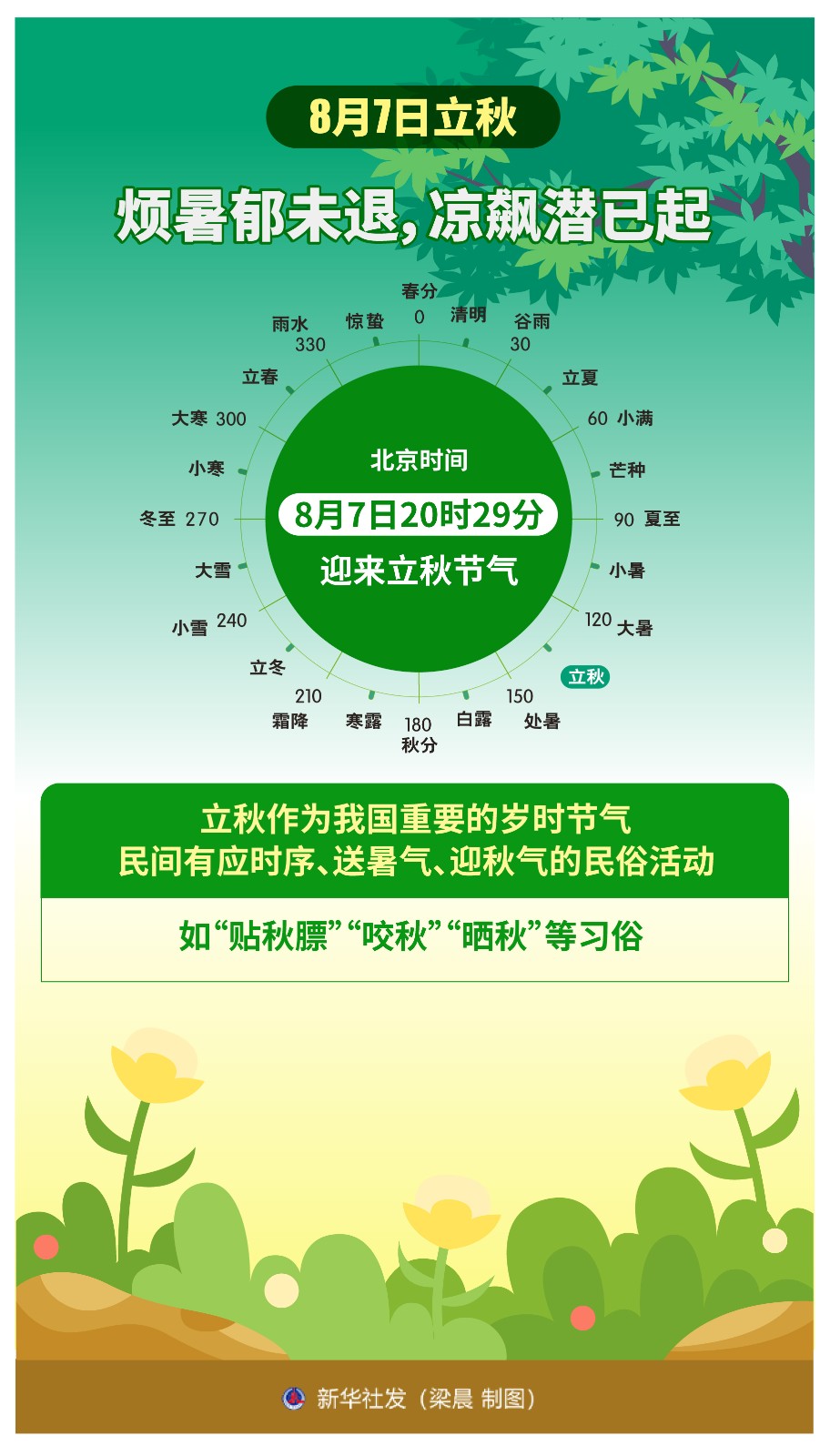 “煩暑郁未退,涼飆潛已起”,北京時(shí)間8月7日20時(shí)29分將迎來(lái)立秋節(jié)氣。此時(shí)雖已立秋,但“秋老虎”依然發(fā)威,炎熱逼人,暑氣一時(shí)難消。