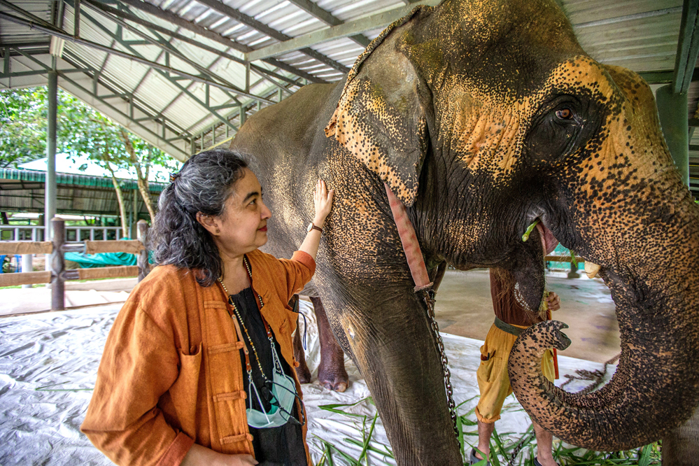 8月6日,在泰國南邦府“亞洲象之友”大象醫(yī)院,蘇賴達·薩瓦拉看望一頭受傷的大象。