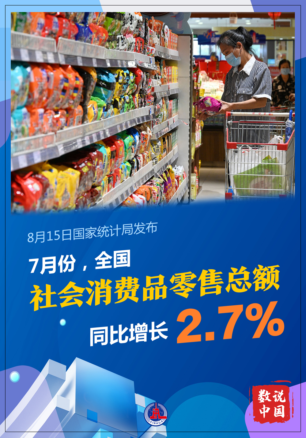 國家統(tǒng)計局8月15日發(fā)布數(shù)據(jù)顯示,7月份,社會消費(fèi)品零售總額同比增長2.7%,比上月回落0.4個百分點;環(huán)比增長0.27%。