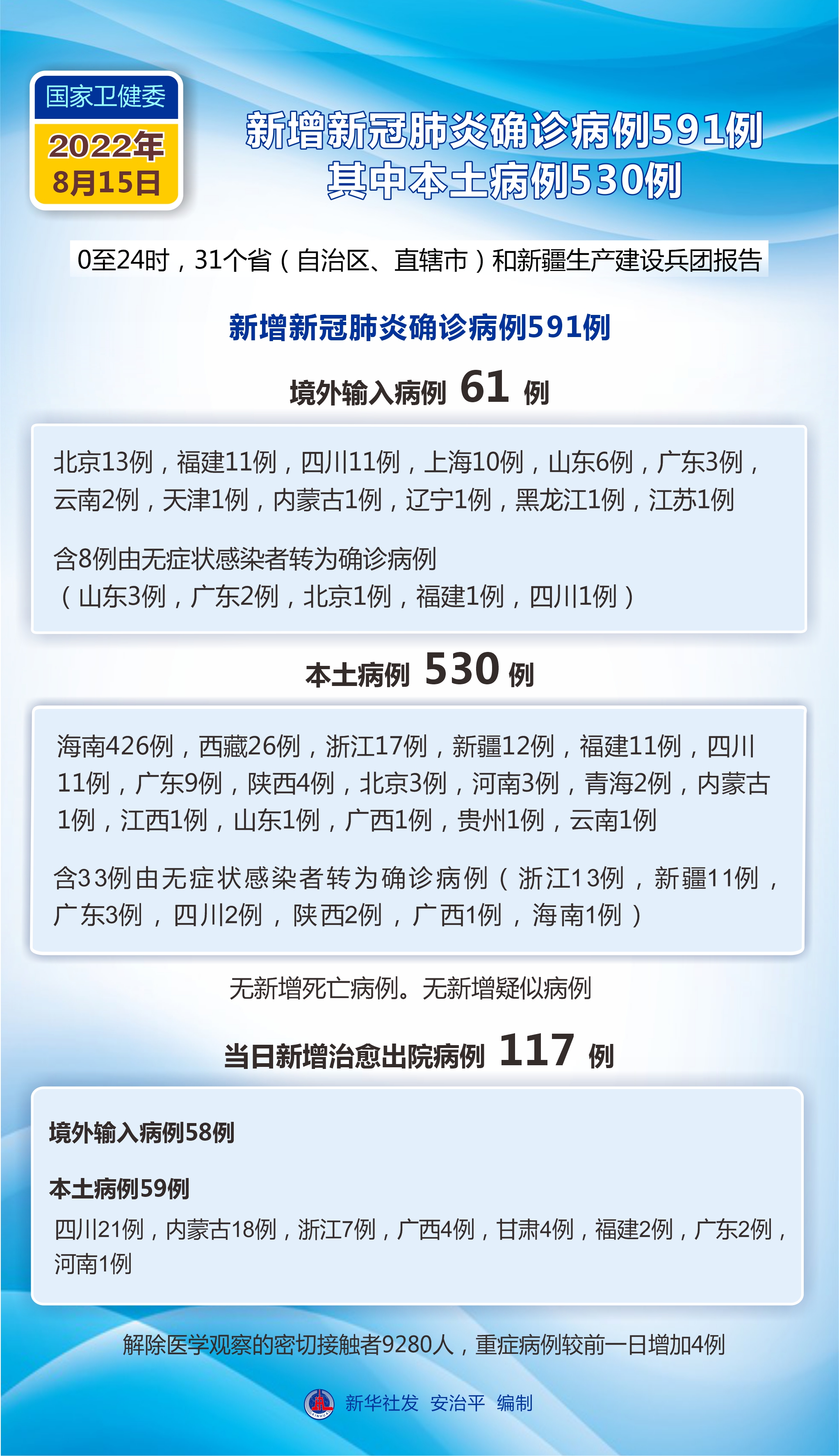 國家衛(wèi)生健康委員會8月16日通報,8月15日0至24時,31個?。ㄗ灾螀^(qū)、直轄市)和新疆生產建設兵團報告新增新冠肺炎確診病例591例。