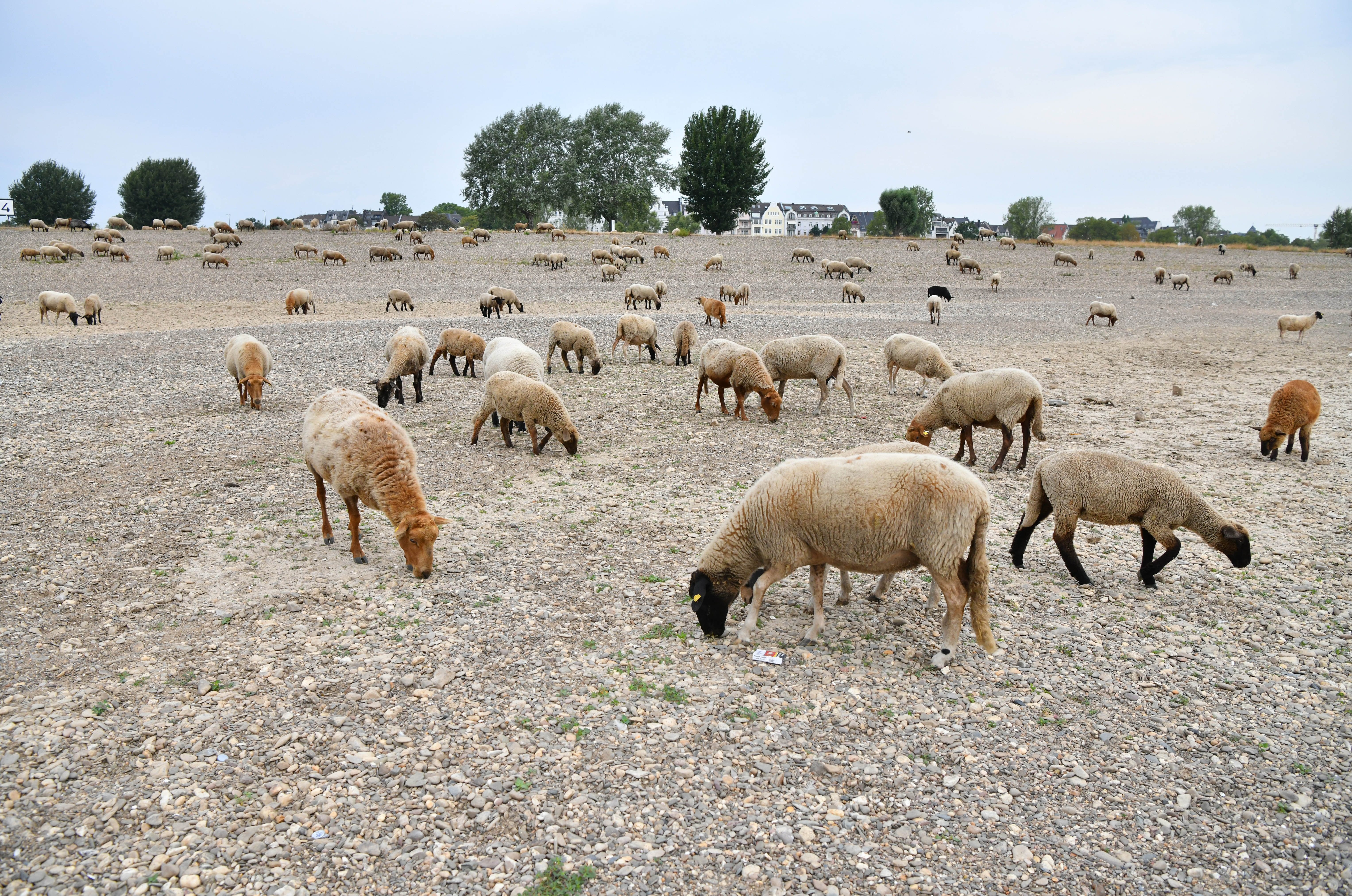 8月17日,在德國(guó)北威州杜塞爾多夫,羊群在萊茵河岸覓食。