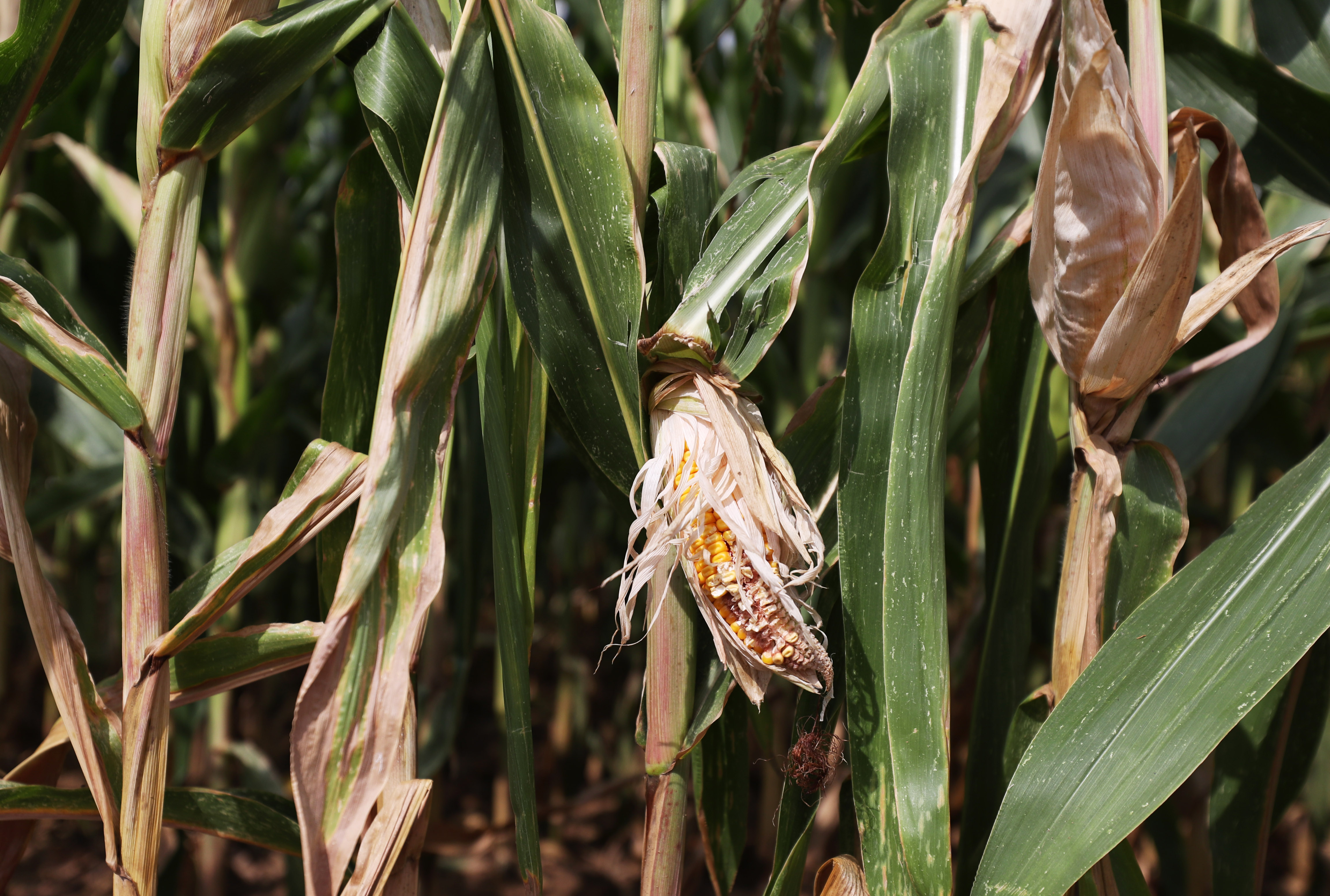 這是8月18日在法國巴黎西北約30公里處的皮伊塞-蓬圖瓦茲拍攝的受旱情影響的玉米田。