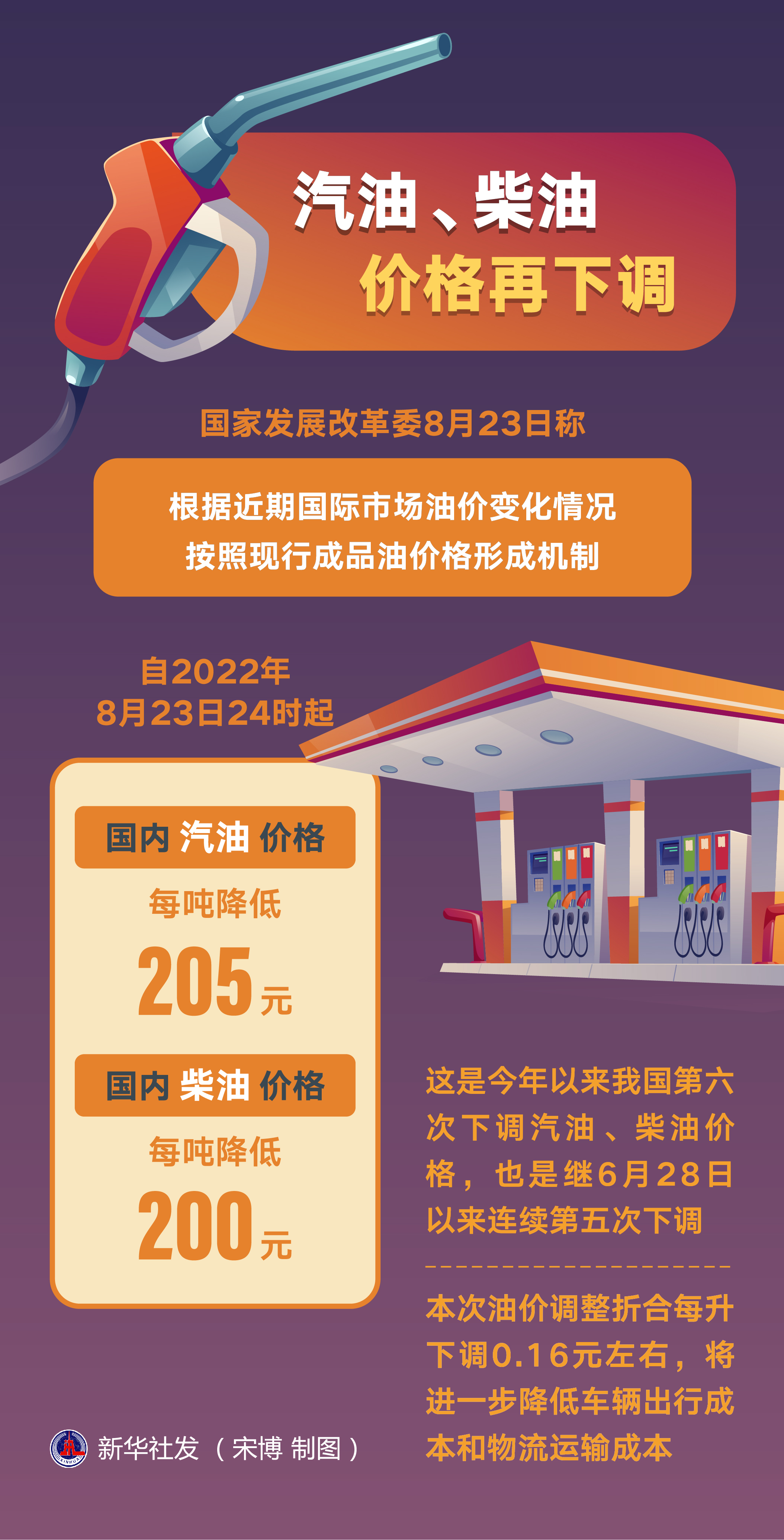 國家發(fā)展改革委8月23日稱,根據(jù)近期國際市場(chǎng)油價(jià)變化情況,按照現(xiàn)行成品油價(jià)格形成機(jī)制,自2022年8月23日24時(shí)起,國內(nèi)汽油、柴油價(jià)格每噸分別降低205元和200元。