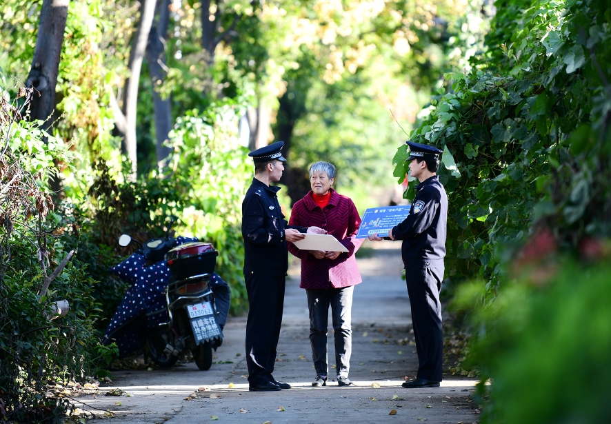 10月9日,安徽省阜南縣公安局城西派出所民警在轄區(qū)一居民家門口宣講防范網(wǎng)絡(luò)電信詐騙和養(yǎng)老詐騙常識。