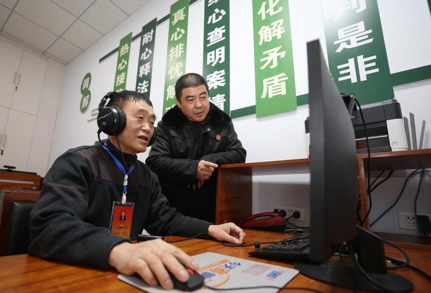 圖為 1月4日,法院工作人員與人民調(diào)解員對一起民間借貸糾紛案進行線上調(diào)解。