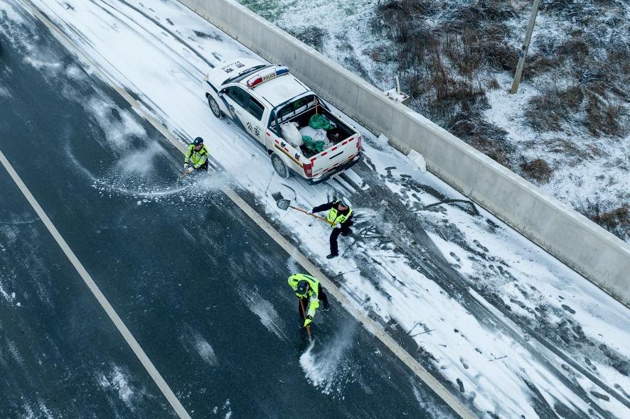 1月15日,安徽省馬鞍山市和縣公安局交警大隊民警在橋面上灑鹽融雪,保障道路安全暢通。