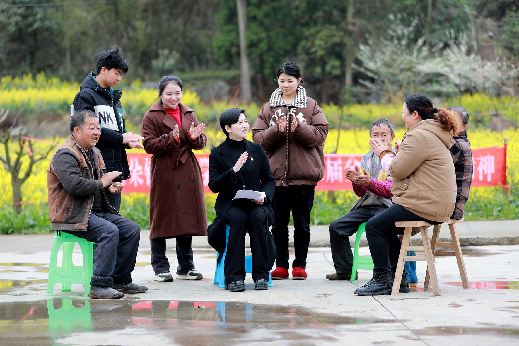 3月19日,全國人大代表、貴州省黔西市雨朵鎮(zhèn)黨委書記付慶梅(左四)在雨朵鎮(zhèn)小水井村,向村民傳達兩會精神,分享感受和體會。