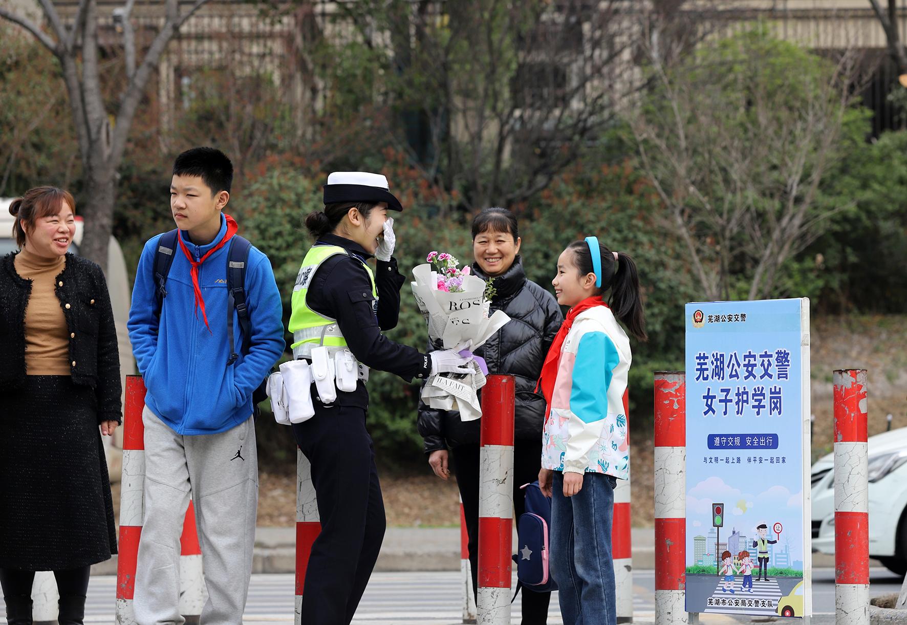 3月8日,安徽省蕪湖市安徽師范大學附屬小學西校區(qū)的一位小學生向正在“護學崗”執(zhí)勤的女民警送上節(jié)日的祝福。