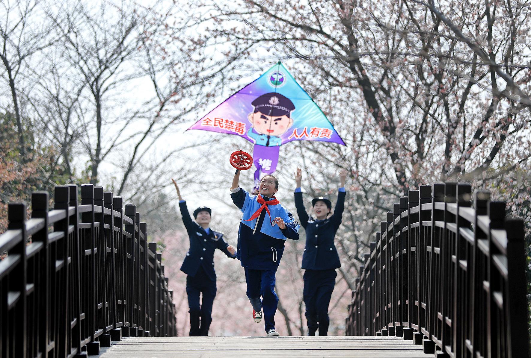 3月9日,湖北省沙洋縣公安局禁毒大隊民警在曾集鎮(zhèn)雷都村櫻花園,組織春游師生開展“無毒青春”禁毒風箏放飛宣傳活動。