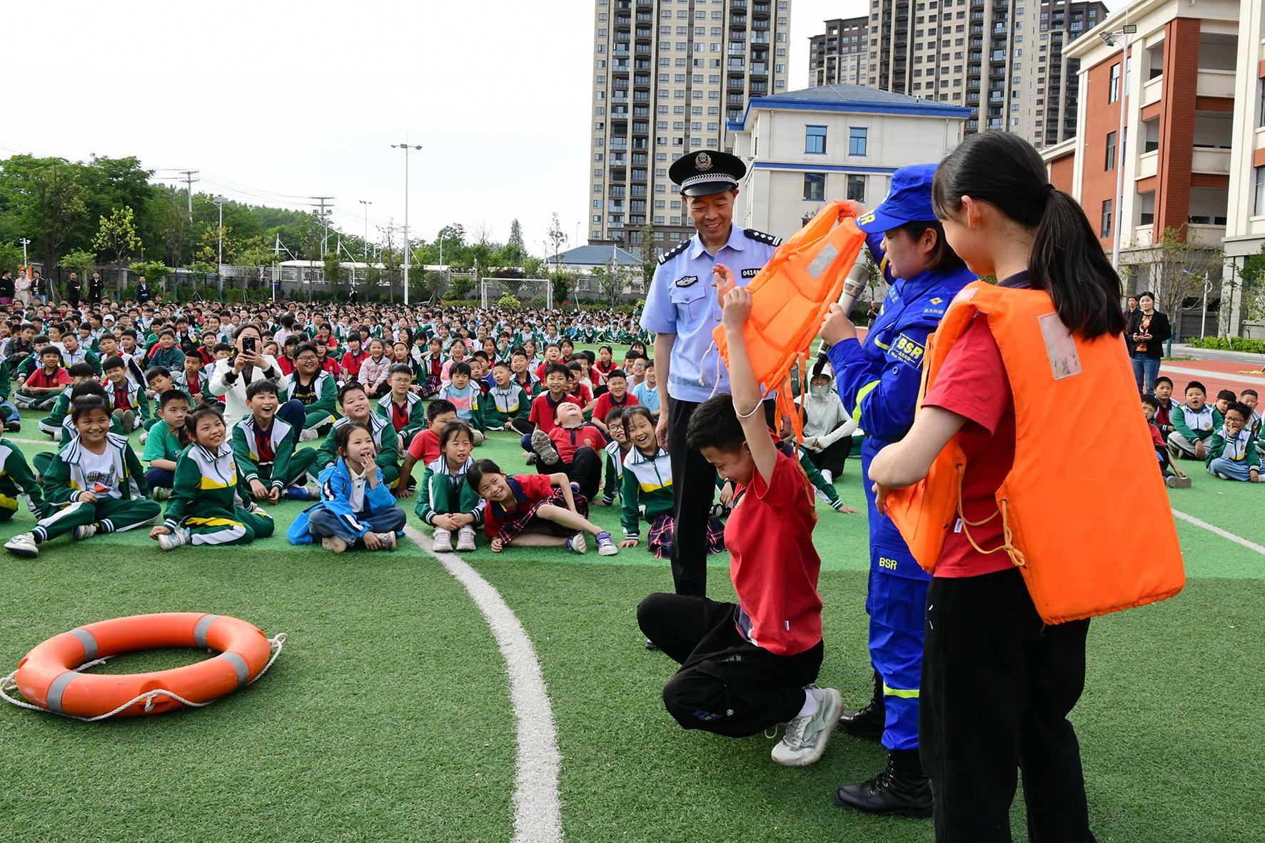 5月9日,安徽省阜陽市阜南縣公安局城關(guān)派出所民警和藍(lán)天救援隊(duì)志愿者在第三小學(xué)為學(xué)生們演示防溺水措施。