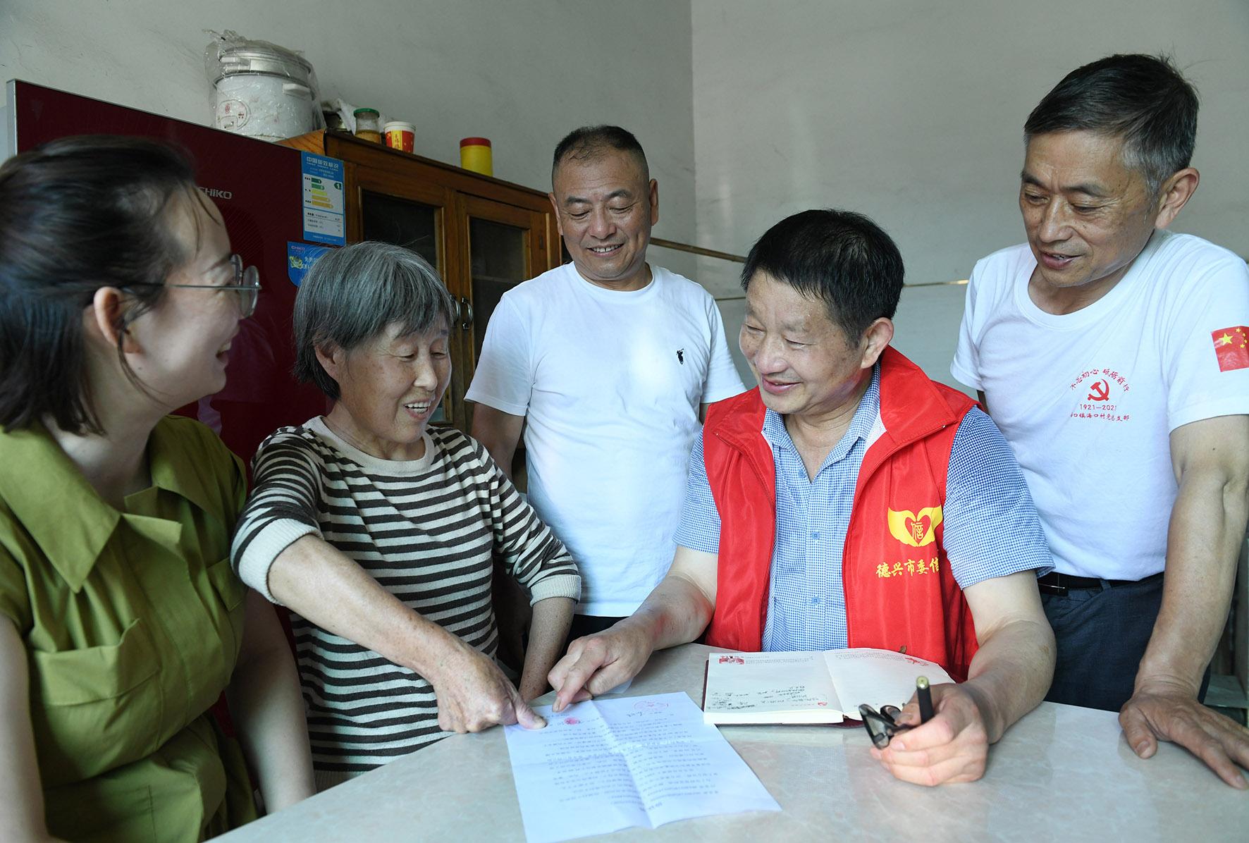 7月4日,江西省德興市??阪?zhèn)退休干部、全國模范人民調(diào)解員應(yīng)火根在??诖宄晒φ{(diào)解一起鄰里房屋地基糾紛,雙方握手言和并簽訂和解協(xié)議。